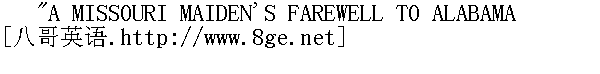 密苏里少女告别阿拉巴马 "Alabama, good-bye! I love thee well! But yet for a while do I leave thee now! Sad, yes, sad thoughts of thee my heart doth swell, And burning recollections throng my brow! For I have wandered through thy flowery woods; Have roamed and read near Tallapoosa's stream; Have listened to Tallassee's warring floods, And wooed on Coosa's side Aurora's beam."Yet shame I not to bear an o'er-full heart, Nor blush to turn behind my tearful eyes; 'Tis from no stranger land I now must part, 'Tis to no strangers left I yield these sighs. Welcome and home were mine within this State, Whose vales I leave -- whose spires fade fast from me And cold must be mine eyes, and heart, and tete, When, dear Alabama! they turn cold on thee!" 再见,阿拉巴马!我爱你笃深,离别虽短暂,难舍又难分!想到你,往事历历燃胸间,爱怜又悲伤。曾记否,万花丛中留下我的足迹,德拉波斯溪旁有我朗朗的读书声;我听过德达西的流水犹如万马奔腾,我见过库萨山巅晨曦的分娩。我心系百事,无悔无怨, 含泪回首,心平气缓。我告别的是我熟悉的地方,见我叹息的也不是异乡他客;来到该州,我宾至如归,可如今我将远离高山大谷。 亲爱的阿拉巴马,一旦我心灰意冷, 那时,我真的告别人寰。 There were very few there who knew what "tete" meant, but the poem was very satisfactory, nevertheless. 在场的人没有几个理解她"真的告别人寰"的含义,不过这首诗还是令人满意的。 Next appeared a dark-complexioned, black-eyed, black-haired young lady, who paused an impressive moment, assumed a tragic expression, and began to read in a measured, solemn tone: 接着又上来一位姑娘。她黑眼睛、黑头发连皮肤也黝黑。上来后,她稍作停顿,这一停顿令人难忘。随后她一副痛苦不堪的样子,用庄严而又有节奏的语调开始念起来。 "A VISION 一个梦想