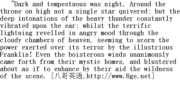 夜色深沉,狂风肆虐,暴雨倾盆。老天爷高高在上,四周无半点星辰闪烁;炸雷滚滚,满天轰鸣,震耳欲聋。 愤怒的闪电穿过乌云,划破夜空,大有吞噬富兰克林之感。这位杰出的科学家在闪电交织的时候勇敢地放飞风筝以测电能。大风也平地而起,以助雷电群起而攻之,场面更加荒凉无比。 "At such a time,so dark,so dreary, for human sympathy my very spirit sighed; but instead thereof,"'My dearest friend, my counsellor, my comforter and guide My joy in grief, my second bliss in joy,' came to my side. 如此时刻,如此黑暗阴沉,我心生慈悲为众生哀叹。"我最亲爱的朋友、老师、我的安慰者和向导-- 我的悲伤中的快乐,我随着欢乐而来的福,"来到我身边。 She moved like one of those bright beings pictured in the sunny walks of fancy's Eden by the romantic and young, a queen of beauty unadorned save by her own transcendent loveliness. So soft was her step, it failed to make even a sound, and but for the magical thrill imparted by her genial touch, as other unobtrusive beauties, she would have glided away un-perceived -- unsought. A strange sadness rested upon her features, like icy tears upon the robe of December, as she pointed to the contending elements without, and bade me contemplate the two beings presented." 她像浪漫的年轻画家画的伊甸园里的仙女一般,漫步在阳光下,一个朴实无华巧夺天工的绝代佳人。她步履轻盈来去无声无息。要不是她也和别的仙女一样轻抚人间,令人神奇为之震颤,她会像浮云一般让人不知不觉,消失得无影无踪。她指着外面酣战的狂风暴雨要人们想想它们各象征着什么,这时她脸上莫名其妙地顿生愁云,犹如寒冬腊月里的天气令人颤栗。 This nightmare occupied some ten pages of manuscript and wound up with a sermon so destructive of all hope to non-Presbyterians that it took the first prize. This composition was considered to be the very finest effort of the evening. The mayor of the village, in delivering the prize to the author of it, made a warm speech in which he said that it was by far the most "eloquent" thing he had ever listened to, and that Daniel Webster himself might well be proud of it. 令人可怕的描述差不多用了十页稿纸,结尾仍是一段说教词,把非长老会的教徒说得一点希望都没有,这篇文章因此而获得了头奖,被认为是当天晚上最优秀的作文。镇长在颁奖时,发表了一番热情洋溢的讲话。他说这篇文章是他平生以来听到的"最美"的文章,连大演说家丹尼尔·韦伯斯特听了也会感到骄傲的。 It may be remarked, in passing, that the number of compositions in which the word "beauteous" was over-fondled, and human experience referred to as "life's page," was up to the usual average. 顺便说一下,有些人过多使用"美好"两个字,爱把人生的经历比喻成"人生的一页",这样的文章像平常一样出现了很多。
