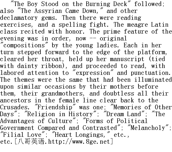 随后有人背诵了"那个男孩子站在燃烧的甲板上","亚述人走来了"等一些名篇。接下来的是朗读表演和拼写比赛。寥寥数人的拉丁语班背诵时显得无比自豪。最后晚上的黄金节目终于到了--姑娘们自己的"独创大作"。大家一个接一个走上前站在讲台边,等清完嗓子就拿出稿子(用鲜艳的缎带扎着)念起来。她们个个念得有声有色,十分卖力让人都觉得有点不自然。文章的主题都是她们的母亲和祖母们在同样场合下早已发挥过的。毫无疑问,由此可以追溯到十字军时代她们家族的母系祖先们,人人都用过这类主题,《友情论》就是其中之一。另外还有《昔日重来》、《历史上的宗教》、《梦境》、《文化的优点》、《政体比照论》、《伤感》、《孝道》、《心愿》等等。 A prevalent feature in these compositions was a nursed and petted melancholy; another was a wasteful and opulent gush of "fine language"; another was a tendency to lug in by the ears particularly prized words and phrases until they were worn entirely out; and a peculiarity that conspicuously marked and marred them was the inveterate and intolerable sermon that wagged its crippled tail at the end of each and every one of them. No matter what the subject might be, a brain-racking effort was made to squirm it into some aspect or other that the moral and religious mind could contemplate with edification. The glaring insincerity of these sermons was not sufficient to compass the banishment of the fashion from the schools, and it is not sufficient to-day; it never will be sufficient while the world stands, perhaps. There is no school in all our land where the young ladies do not feel obliged to close their compositions with a sermon; and you will find that the sermon of the most frivolous and the least religious girl in the school is always the longest and the most relentlessly pious. But enough of this. Homely truth is unpalatable. 这类文章的共同特点有三个:一是无病呻吟,故作悲伤;二是堆砌词语,滥用华丽词藻;三是特别偏爱一些陈词滥调。此外,这些文章有个显著特点,也是它们的败笔之处:就是每篇文章的结尾都有一段根深蒂固的说教词,好像断尾巴的狗一样,令人难受。她们的"独创大作"不管涉及到什么内容,她们都绞尽脑汁,千方百计让人思索以便获得道德或宗教上的启示。在众目睽睽之下,这种说教虽然给人以假话的感觉,但这种风气还是消除不了,时至今日依然如故。也许只要世界存在一天,这种毫无诚意的说教就永远消灭不了。在这个国度里,有哪所学校的女生不觉得非在文章的结尾加上一段说教词不可呢?更有意思的是你会发现越是不守规矩、不太信仰宗教的那些女孩,她们的文章写的就越长、越虔诚。得了,忠言逆耳,不说这些了。 Let us return to the "Examination." The first composition that was read was one entitled "Is this, then, Life?" Perhaps the reader can endure an extract from it: 我们再接着讲"大考"的情况。朗读的第一篇文章的题目是《难道这就是生活吗?》。下面摘录一段"以飨"读者。 Her graceful form, arrayed in snowy robes, is whirling through the mazes of the joyous dance; her eye is brightest, her step is lightest in the gay assembly."In such delicious fancies time quickly glides by, and the welcome hour arrives for her entrance into the Elysian world, of which she has had such bright dreams. How fairy-like does everything appear to her enchanted vision! Each new scene is more charming than the last. But after a while she finds that beneath this goodly exterior, all is vanity, the flattery which once charmed her soul, now grates harshly upon her ear; the ball-room has lost its charms; and with wasted health and imbittered heart, she turns away with the conviction that earthly pleasures cannot satisfy the longings of the soul!" And so forth and so on. There was a buzz of gratification from time to time during the reading, accompanied by whispered ejaculations of "How sweet!" "How eloquent!" "So true!" etc., and after the thing had closed with a peculiarly afflicting sermon the applause was enthusiastic. 飞舞驰骋的想象描绘出一幅幅玫瑰色欢乐的场景。 时尚的弄潮儿沉溺于纸醉金迷,梦幻中发现自己置身于欢乐的人群,成了众人眼里的明星。她举止优雅,身穿素装长袍,翩翩起舞于欢乐的迷宫。她的眼睛最明亮,她的步伐最轻盈。 梦幻美妙,时光如梭,等待她进入天堂的时刻来临了。她的所见犹如被点化一般,似仙女下凡!每到一处,物变景更美。可时隔不久,她发现漂亮的外表徒有虚名: 曾经令她心花怒放的甜言蜜语,现在铮铮刺耳;舞厅变得平淡无奇;她身心憔悴地退出,笃信世俗之乐何以能够慰藉心灵的企求! 等等、等等诸如此类的话,朗读中,人群里爆发出一阵满意的嗡嗡声,还不时地突然低声说道:"多么美好!""真能服人!""朴实无华!"最后一段布道词特别令人难受,大家都巴不得早点结束。朗读刚完,全场就报以热烈的掌声。 Then arose a slim, melancholy girl, whose face had the "interesting" paleness that comes of pills and indigestion, and read a "poem." Two stanzas of it will do: 下一个站起来的是一位身材瘦弱、性格忧郁的女孩,她脸色苍白得引人注目,那是经常服药和消化不良留下的后遗症。她朗颂了一首"诗歌"。这里节选其中两节就可以了: