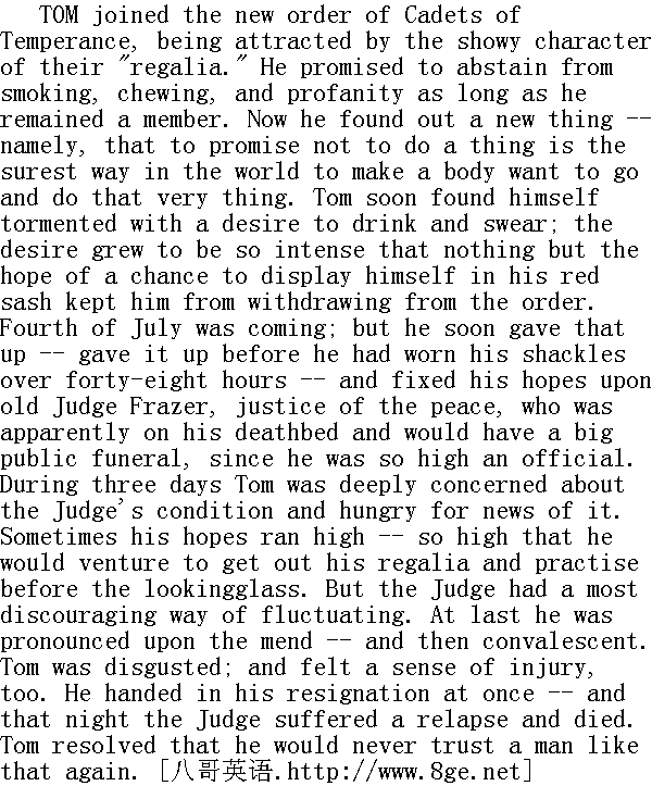 汤姆被少年节制会的漂亮"绶带"吸引住了,就加入了该新组织。他保证入会期间,不抽烟,不嚼烟,不渎神。之后他有了个新发现--那就是,嘴上保证的越漂亮,而实际上干的正好相反。汤姆不久就发觉自己被一种强烈的欲望所折磨,即想抽烟,想破口大骂。这种欲望如此强烈,他真想从节制会退出来,念及自己能有机会佩戴红肩带好好露把脸,他才打消了退会的念头。七月四号快要到了(美国独立纪念日),但不久他就放弃了这个愿望--戴上"枷锁"还不到四十八个小时,他就放弃了这种愿望--又把希望寄托在治安法官弗雷塞老头身上。此人显然行将就木,既然他身居要职,死后一定会有一个盛大的丧礼。三天以来,汤姆深切关注着法官的病情,如饥似渴等着消息。有时,他的希望似乎触手可及--他甚至大胆地拿出他的绶带,对着镜子自我演示一番。但法官病情的进展不尽汤姆的人意。后来,他竟生机重现--接着便慢慢康复了。汤姆对此大光其火;他简直觉得自己受了伤害。于是他马上申请退会--但就在当晚,法官旧病复发,一命呜呼。汤姆发誓以后再也不相信这种人了。 The funeral was a fine thing. The Cadets paraded in a style calculated to kill the late member with envy. Tom was a free boy again, however -- there was something in that. He could drink and swear, now -- but found to his surprise that he did not want to. The simple fact that he could, took the desire away, and the charm of it. 丧礼搞得颇为隆重。少年节制会的会员们神气十足地列队游行,让那位退会的会员忌妒得要死。但不管怎么说,汤姆又恢复自由这很有意义。他又可以喝酒,可以咒娘了--可是他惊奇地发现自己对这些事兴趣索然。道理很简单,他现在自由了,这些做法反而失去了魅力,他可以摆脱欲望了。 Tom presently wondered to find that his coveted vacation was beginning to hang a little heavily on his hands. 汤姆不久就感到,让他梦寐以求的暑假渐渐变得沉闷冗长起来。 He attempted a diary -- but nothing happened during three days, and so he abandoned it. 他试图写写日记--但三天以来,没有什么稀罕事儿发生,于是他又放弃了这个想法。 The first of all the negro minstrel shows came to town, and made a sensation. Tom and Joe Harper got up a band of performers and were happy for two days. 一流的黑人演奏队来到了这个小镇,引起了轰动。汤姆和哈帕组织了一队演奏员,尽情地疯了两天。