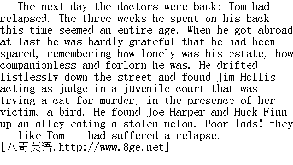 第二天,医生们又来了;汤姆的病又犯了。这一次,他在床上躺了三周,在他看来,仿佛是整整一个世纪。当他从病床上起来的时候,回想起自身多么地凄苦,无助而寂寞,他竟然觉得未遭雷击算不上什么可喜可贺的事。他茫然地走上街头,碰到了吉姆·荷利斯在扮演法官,正在一个儿童法庭上审理一件猫儿咬死小鸟的谋杀案,被害者也在场。他还发现乔·哈帕和哈克·费恩正在一条巷子里吃偷来的甜瓜。可怜的孩子!他们--也像汤姆一样--老毛病又犯了。 |