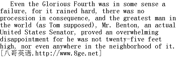 就连光荣的七月四日从某种意义上说,也没那么热闹了。因为那天下了场大雨,所以没有队伍游行,而世界上最伟大的人物(在汤姆看来),一个真正的美国参议员本顿先生,令人失望--因为事实上他身高并没有二十五英尺,甚至远远挨不上这个边儿。 A circus came. The boys played circus for three days afterward in tents made of rag carpeting -- admission, three pins for boys, two for girls -- and then circusing was abandoned. 马戏团来了。从那以后,孩子们用破毯子搭起一个帐篷,一连玩了三天的马戏--入场券是:男孩子要三根别针,女孩子要两根--不久,马戏也不玩了。 A phrenologist and a mesmerizer came -- and went again and left the village duller and drearier than ever. 后来,又来了一个骨相家和一个催眠师--他们也走了,这个镇子较之以往更加沉闷、更加乏味。 There were some boys-and-girls' parties, but they were so few and so delightful that they only made the aching voids between ache the harder. 有人举办过男孩子和女孩子的联欢会,但次数有限,况且联欢会又那么有趣,所以在没有联欢会的日子里,空虚的、苦恼的气味更浓了。 Becky Thatcher was gone to her Constantinople home to stay with her parents during vacation -- so there was no bright side to life anywhere. 贝基·撒切尔去康士坦丁堡镇的家里,和她父母一起度暑假去了--所以,无论怎样过,生活皆无乐趣可言。