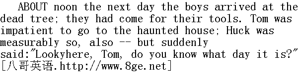 第二天大约在中午,这两个孩子到那棵枯树前来拿工具。汤姆急不可耐地要到那个闹鬼的屋子去;显然哈克也想去,可却突然说:"喂,我说汤姆,你知道今天是什么日子?" Tom mentally ran over the days of the week, and then quickly lifted his eyes with a startled look in them -- 汤姆脑子转了转,合计着日子,接着迅速地抬起眼睛,一副惊讶的表情。 "My! I never once thought of it, Huck!" " 我的妈呀!哈克,我还没想到这一点呢!" "Well, I didn't neither, but all at once it popped onto me that it was Friday." " 哦,我也是的,不过,我刚才忽然想起今天是星期五。"(星期五是基督耶稣受难的日子,所以基督徒们认为它是个不吉利的日子。) "Blame it, a body can't be too careful, Huck. We might 'a' got into an awful scrape, tackling such a thing on a Friday." " 真该死,哈克,得仔细点才行。我们在这个日子干这种事情,可能是自找麻烦。"