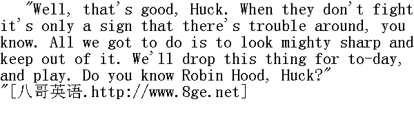 嗯,这还行。哈克,梦见耗子但没梦见它们打架,这说明要有麻烦事了。我们要特别、特别地小心,设法避开它就没事了,今天算了,去玩吧。哈克,你知道罗宾汉吗?" "No. Who's Robin Hood?" " 不知道。他是谁?" "Why, he was one of the greatest men that was ever in England -- and the best. He was a robber." " 嘿,这你都不知道。他可是英国有史以来最伟大的人物之一,也是最好的一个。他是个强盗。" "Cracky, I wisht I was. Who did he rob?" " 嗳哟,真了不起,我要也是就好了。他抢谁呢?" "Only sheriffs and bishops and rich people and kings, and such like. But he never bothered the poor. He loved 'em. He always divided up with 'em perfectly square." " 他劫富济贫,抢的都是郡长、主教、国王之类的富人。他不但不骚扰穷人,而且还跟他们平分抢来的东西。"