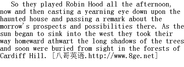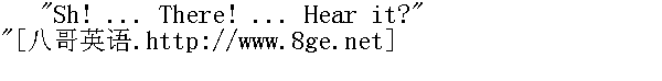 他俩玩了一下午的罗宾汉游戏,边玩边忍不住不时地朝那座闹鬼的房子看上一两眼,三言两语地议论着第二天到那里去会发生的情况。太阳西沉时,他俩顺着长长的树影往家走去,不久就消失在卡第夫山的树林中。 On Saturday, shortly after noon, the boys were at the dead tree again. They had a smoke and a chat in the shade, and then dug a little in their last hole, not with great hope, but merely because Tom said there were so many cases where people had given up a treasure after getting down within six inches of it, and then somebody else had come along and turned it up with a single thrust of a shovel. The thing failed this time, however, so the boys shouldered their tools and went away feeling that they had not trifled with fortune, but had fulfilled all the requirements that belong to the business of treasure-hunting. 星期六中午刚过不久,两个孩子又来到那棵死树旁。他俩先在树荫下抽了一会烟,聊了几句,然后又在剩下的一个洞里继续挖了几锹。当然这样做并非出于抱有多大的希望,只是因为汤姆说过有许多回挖宝的人离宝只有六寸,结果还是让别的人一锹就给挖走了。不过,这一次他俩没那么幸运,于是他们就扛起工具走了,他们很看重财宝,而且就挖宝而言,他们已尽了最大的努力。 In a little while familiarity modified their fears and they gave the place a critical and interested examination, rather admiring their own boldness, and wondering at it, too. Next they wanted to look up-stairs. This was something like cutting off retreat, but they got to daring each other, and of course there could be but one result -- they threw their tools into a corner and made the ascent. Up there were the same signs of decay. In one corner they found a closet that promised mystery, but the promise was a fraud ,there was nothing in it. Their courage was up now and well in hand. They were about to go down and begin work when -- 片刻之后,他俩熟悉了这个地方,不再像刚进来时那样害怕了。于是,他们仔仔细细地审视了一番,既惊奇又十分佩服自己的胆量。接着,他们想上楼看看,这似乎是有点背水一战的意味,他俩得相互壮胆,于是他们把手中的家伙扔到墙角就上了楼。楼上的情景与楼下的一样破落。他们很快发现墙角处有个壁橱,好像里面有点看头,可结果是一无所有。这时的他们胆子大多了,勇气十足。正当他俩准备下楼动手时-- "Sh!" said Tom. " 嘘!"汤姆说。 "What is it?" whispered Huck, blanching with fright. " 怎么回事?"哈克脸色吓得发白,悄悄地问道。