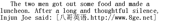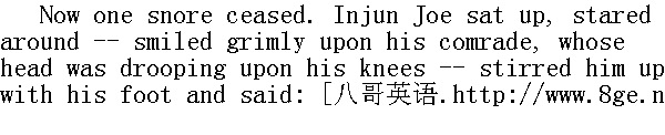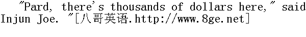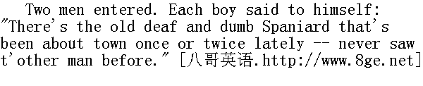 进来了两个男人,两个孩子都低低自语道:"一个是那个又聋又哑的西班牙老头,近来在镇上露过一两次面,另一个是陌生人。" "T'other" was a ragged, unkempt creature, with nothing very pleasant in his face. The Spaniard was wrapped in a serape; he had bushy white whiskers; long white hair flowed from under his sombrero, and he wore green goggles. When they came in, "t'other" was talking in a low voice; they sat down on the ground, facing the door, with their backs to the wall, and the speaker continued his remarks. His manner became less guarded and his words more distinct as he proceeded: " 另一个人"衣衫褴褛,蓬头垢面,脸上表情令人难受;西班牙老头披一条墨西哥花围巾,脸上长着密密麻麻的白色络腮胡,头戴宽边帽,长长的白发垂下,鼻子上架一副绿眼镜。进屋后,"另一个人"低声说着什么,两人面对门,背朝墙,坐在地板上,"另一个人"继续说着,神情也不太紧张了, "No," said he, "I've thought it all over, and I don't like it. It's dangerous." 话也越来越清楚:"不行,"他说,"我反复琢磨,我还是不想干,这事太危险。" "Dangerous!" grunted the "deaf and dumb" Spaniard -- to the vast surprise of the boys. "Milksop!" " 危险!"那又聋又哑的西班牙人咕哝着说,"没出息!"两个孩子见此大吃一惊。 This voice made the boys gasp and quake. It was Injun Joe's! There was silence for some time. Then Joe said: 这个声音吓得两个孩子喘不过气来,直发抖,是印第安·乔的声音!沉默了一会,乔说:
