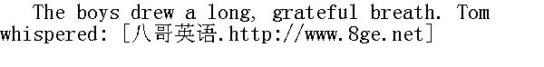 两个孩子深深地吸了口气,真是谢天谢地。汤姆低声说: "Now's our chance -- come!" " 机会来了--快点!" Huck said: 哈克说: "I can't -- I'd die if they was to wake."" 不行,要是他们醒来,我非死不可。" Tom urged -- Huck held back. At last Tom rose slowly and softly, and started alone. But the first step he made wrung such a hideous creak from the crazy floor that he sank down almost dead with fright. He never made a second attempt. The boys lay there counting the dragging moments till it seemed to them that time must be done and eternity growing gray; and then they were grateful to note that at last the sun was setting. 汤姆催他走--哈克老是不敢动。结果汤姆慢慢站起身,轻轻地一人往外走。可他一迈步,那摇摇晃晃的破楼板就吱吱作响,吓得他立即趴下,像死了一样,他不敢再动一下,两个孩子躺在那里一分一秒地数着时间,似有度日如年之感,最后他俩觉得日子终于熬到了头,看到日落西山,心中充满感激之情。