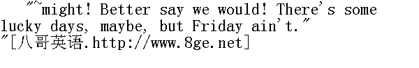 你说可能。最好还是说一定!要是换成别的日子,说不定会有救,可是今天不成。" "Any fool knows that. I don't reckon YOU was the first that found it out, Huck." " 这连傻瓜都知道。不过,哈克,我想除你之外,还有别人明白这个理。" "Well, I never said I was, did I? And Friday ain't all, neither. I had a rotten bad dream last night -- dreampt about rats." " 哼!我说过就我一人明白了吗?光星期五还不够。昨天夜里,我做了一个糟糕透顶的梦--梦见耗子了。" "No! Sure sign of trouble. Did they fight?" " 真是瞎胡闹!一准要倒霉了。它们打架了吗?" "No." " 没有。"
