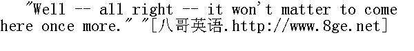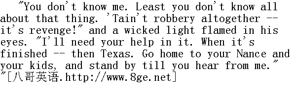 你不了解我,至少你不全知道那件事。那不完全是抢劫--那是复仇啊!"他眼里射出凶恶的光。"这事得你帮我,干完活就到得州去,回去看你老婆和孩子们,等我的消息。" "Well -- if you say so; what'll we do with this -- bury it again?" " 好--如果是这样的,那么这箱金币怎么办?--再埋在这里?" "Yes. [Ravishing delight overhead.] No! by the great Sachem, no! [Profound distress overhead.] I'd nearly forgot. That pick had fresh earth on it! [The boys were sick with terror in a moment.] What business has a pick and a shovel here? What business with fresh earth on them? Who brought them here -- and where are they gone? Have you heard anybody? -- seen anybody? What! bury it again and leave them to come and see the ground disturbed? Not exactly -- not exactly. We'll take it to my den." " 对,(楼上高兴得欢天喜地。)不!好家伙!绝对不行!(楼上的情绪一落千丈。)我差点忘了,那把铁锹上还有新泥土呢!(两个孩子一听吓得要命。)这里要锹和镐头干什么?是谁拿来的?--人呢?听见有人吗?看见了吗?好家伙,还要把箱子埋起来,让他们回来好发现这里有人动过土?不行,这样不妥,我们把箱子拿到我那里去。" "Why, of course! Might have thought of that before. You mean Number One?" " 说得对呀,干吗不呢?早该想到这主意,你是说要拿到一号去?" "No -- Number Two -- under the cross. The other place is bad -- too common." " 不,是二号,十字架下面的,别的地方不行,没有特别的地方。"