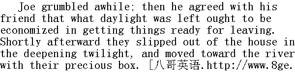 乔咕哝了一阵,然后觉得同伴说得有道理,乘天黑之前,抓紧时间,收拾收拾东西好离开。随后他俩在渐渐沉下来的暮色中溜出去,带着宝箱往河那边走去。 Tom and Huck rose up, weak but vastly relieved, and stared after them through the chinks between the logs of the house. Follow? Not they. They were content to reach ground again without broken necks, and take the townward track over the hill. They did not talk much. They were too much absorbed in hating themselves -- hating the ill luck that made them take the spade and the pick there. But for that, Injun Joe never would have suspected. He would have hidden the silver with the gold to wait there till his "revenge" was satisfied, and then he would have had the misfortune to find that money turn up missing. Bitter, bitter luck that the tools were ever brought there! 汤姆和哈克站起来,虽然很乏,但现在舒服多了,他俩从房子的木条缝中盯着那两个人的背影。跟踪他们?他俩不行,从屋上平安下来没有扭伤脖子,再翻过山顺着小路返回城中,已经是不错的事情了。他俩没再多说,只是一个劲地埋怨自己,怪运气不好,才把那倒霉的锹和镐头带到这儿来。要不是这两样工具,印第安·乔决不会起疑心。他会把装金币的箱子藏在这里,然后去报仇,等回来后会伤心地发现东西不翼而飞。怎么想起来把工具带到这儿来呢,真是该死,倒霉透顶! They resolved to keep a lookout for that Spaniard when he should come to town spying out for chances to do his revengeful job, and follow him to "Number Two," wherever that might be. Then a ghastly thought occurred to Tom. 他们打定主意,等那个西班牙人进城刺探、伺机报仇时,一定要盯梢他,跟他到"二号"去,管他上天入地都要跟去。 突然一个可怕的念头出现在汤姆的脑海里。 "Revenge? What if he means us, Huck!" " 报仇?哈克,要是他们指的是我俩,那可怎么办?" "Oh, don't!" said Huck, nearly fainting. " 噢,别讲了。"哈克说着,差点昏过去。