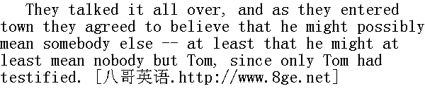 他俩仔细商量了一番,进城后权当他指的是另外的人,至少是指汤姆,因为只有汤姆在法庭上作过证。 Very, very small comfort it was to Tom to be alone in danger! Company would be a palpable improvement, he thought. 汤姆一人陷入危险,确实让他感到不安,很有点不安。他想,要是有个同伴,多少要好 受些。 |