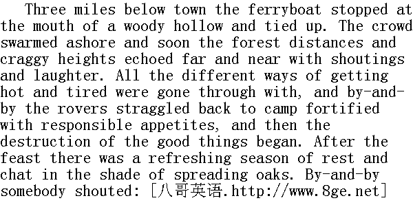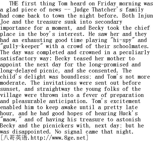 早期五早晨,汤姆听到的第一件事情是条好消息:撒切尔法官一家前天晚上又回到了城里。现在印第安·乔和那份财宝变得次要了,贝基吸引了这孩子的全部兴趣。他见到了她,俩人一起和一群同学捉迷藏,玩"守沟"游戏,痛快极了。这一天大家玩得特别痛快,另外还有一件事情特别令人愉快:贝基缠着她妈妈,要她答应第二天去野餐,因为她老早答应过的,可一直到现在都没有兑现。母亲同意了。孩子的欢乐无止无境,汤姆也大致如此,太阳没落山,请帖就送了出去,村里的年青人立即忙活起来,准备着,激动地等待着这一时刻的到来。汤姆也激动得很晚才睡着,他怀着极大的希望等着听哈克的"猫"叫,好在第二天野餐时拿出财宝给贝基和参加野餐的人一个惊喜,可他的如意算盘落了空,令他失望的是那天晚上根本没有任何"猫"叫声传来。 Morning came, eventually, and by ten or eleven o'clock a giddy and rollicking company were gathered at Judge Thatcher's, and everything was ready for a start. It was not the custom for elderly people to mar the picnics with their presence. The children were considered safe enough under the wings of a few young ladies of eighteen and a few young gentlemen of twenty-three or thereabouts. The old steam ferry-boat was chartered for the occasion; presently the gay throng filed up the main street laden with provision-baskets. Sid was sick and had to miss the fun; Mary remained at home to entertain him. The last thing Mrs. Thatcher said to Becky, was: 早晨到了,10点、11点左右撒切尔法官家门口聚集了一群颠颠狂狂、闹闹哄哄的孩子们,全都准备好了就等出发。大人们照例不参加这样的野餐以免扫兴。因为有几个18岁的姑娘和23岁左右的小伙子加盟,所以孩子们在一起野餐不会出事的。这次他们租了那只老蒸汽渡船,随后欢乐的人群带着盛满吃的东西的篮子排着队走上大街。希德生病,没法和大家联欢,玛丽留在家中陪他玩。撒切尔夫人临走时最后对贝基说: "You'll not get back till late. Perhaps you'd better stay all night with some of the girls that live near the ferry-landing, child." " 孩子,要是很晚才回来,你不如到离码头很近的女孩家去住。" "Then I'll stay with Susy Harper, mamma." " 妈妈,那我就到苏珊·哈帕家去住。" "Very well. And mind and behave yourself and don't be any trouble." " 行,到人家注意点,别调皮啊!"