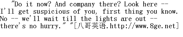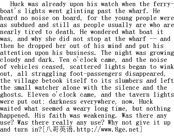 哈 渡船的灯光一摇一闪从码头边经过时,哈克已经开始守夜了。他没听见船上有什么声音,那群年青人现在不声不响,好像累得要命。克不知道这是条什么船,随后他不再想船的事,专心致志于守夜。晚上起了云,天色越来越暗,10点时,车辆的声音停止了,四处的灯火开始熄灭,行人也都散尽,整个村庄进入了梦乡,只有这个小家伙,独自一人空守寂寞,与魔鬼作伴。11点钟,客栈也熄了灯,现在到处一片漆黑。哈克等了很长一段时间,等得乏人,可仍无动静,他开始动摇了,还守在这里有什么用呢?真有用吗?不如回去睡觉算了。 A noise fell upon his ear. He was all attention in an instant. The alley door closed softly. He sprang to the corner of the brick store. The next moment two men brushed by him, and one seemed to have something under his arm. It must be that box! So they were going to remove the treasure. Why call Tom now? It would be absurd -- the men would get away with the box and never be found again. No, he would stick to their wake and follow them; he would trust to the darkness for security from discovery. So communing with himself, Huck stepped out and glided along behind the men, cat-like, with bare feet, allowing them to keep just far enough ahead not to be invisible. 突然他听到了动静。他立即全神贯注地听着,小巷的门轻轻关上。他连跑带跳来到砖厂拐弯的地方,这时两个男人从他身边一掠而过,其中一人腋下挟着件东西,一定是宝箱!他们是在转移财宝啊!现在不能叫汤姆,否则太傻了,那两个人会逃跑。一旦跑了再也不要指望能找到他们。对,他要盯着他俩,跟在后边走,靠夜色来掩护自己。哈克心里边合计着,边光着脚溜出去,像猫似的跟在那两人后头,离得不远不近,始终保持着能看见他们就行了。 They moved up the river street three blocks, then turned to the left up a cross-street. They went straight ahead, then, until they came to the path that led up Cardiff Hill; this they took. They passed by the old Welshman's house, half-way up the hill, without hesitating, and still climbed upward. Good, thought Huck, they will bury it in the old quarry. But they never stopped at the quarry. They passed on, up the summit. They plunged into the narrow path between the tall sumach bushes, and were at once hidden in the gloom. Huck closed up and shortened his distance, now, for they would never be able to see him. He trotted along awhile; then slackened his pace, fearing he was gaining too fast; moved on a piece, then stopped altogether; listened; no sound; none, save that he seemed to hear the beating of his own heart. The hooting of an owl came over the hill -- ominous sound! But no footsteps. Heavens, was everything lost! He was about to spring with winged feet, when a man cleared his throat not four feet from him! Huck's heart shot into his throat, but he swallowed it again; and then he stood there shaking as if a dozen agues had taken charge of him at once, and so weak that he thought he must surely fall to the ground. He knew where he was. He knew he was within five steps of the stile leading into Widow Douglas' grounds. Very well, he thought, let them bury it there; it won't be hard to find. 他们顺着沿河的街道走了三个街区后,向左转上了十字街,然后径直往前来到通向卡第夫山的那条小路。他们又上了这条路,经过半山腰的威尔斯曼的老房子,仍一直往上爬。好吧,哈克心里想,他们会把宝箱埋在石坑里。可那两个人却经过老石坑,爬上了山顶他们一头钻进了茂密的漆树之间的一条小路,一下子就消失在黑暗中。哈克靠上去缩短了距离,因为那两人现在绝不会看见他。他小跑一阵,担心跑得太快;然后又放慢脚步,他向前走了一段路后,就停下来,听一听,没声音;除他呼呼的心跳声音外,什么也听不到。山那边传来猫头鹰的叫声--不祥的声音!可是却没有脚步声。老天啊,什么都不见了!他正想拔脚去追,这时不到四英尺的地方,有个男人在清嗓子。哈克的心一下子跳到嗓子眼,他强忍着,站在那里好像打摆子似的直抖,直抖得要摔倒在地上。他知道他在什么地方。现在他在离道格拉斯寡妇家庭院的阶梯口不到五步远的地方。这很好,就让他们在这里埋宝吧,这里找起来不难。 Now there was a voice -- a very low voice -- Injun Joe's: 一个声音传来,很低很低,是印第安·乔的声音: "Damn her, maybe she's got company -- there's lights, late as it is." " 他妈的,她家里也许有人--这么晚还亮着灯。"