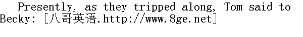 他们走了,路上汤姆对贝基说: "Say -- I'll tell you what we'll do. 'Stead of going to Joe Harper's we'll climb right up the hill and stop at the Widow Douglas'. She'll have ice-cream! She has it most every day -- dead loads of it. And she'll be awful glad to have us." " 喂,告诉你,不要去乔·哈帕家,我们直接去爬山,到道格拉斯寡妇家歇脚。她有冰淇淋,几乎每天吃--多得不得了,我们去,她一准喜欢得要命。" "Oh, that will be fun!" " 噢,太有趣了!" Then Becky reflected a moment and said: 贝基又想了片刻后说: "But what will mamma say?" " 可不知妈妈会怎么想?"