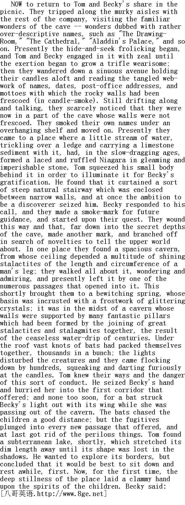 现在再回过头来说说汤姆和贝基参加野餐的情况。他们跟伙伴们一起穿行在黑暗的通道里,游览那些熟悉的洞中奇观--人们给它们起了些过于夸张的名子,诸如什么"客厅"、"大教堂"、"阿拉丁宫殿"等等。在这之后,他们开始玩捉迷藏游戏,玩得极其投入,一直玩到都有点厌烦了为止;然后他俩高举蜡烛,顺着一条弯曲的小路往前逛,边走边念着用蜡烛烟油刻写在石壁上面的名字、年月、通讯地址和格言之类的东西。他俩仍然边走边谈着,不知不觉地来到了另一个山洞。这里的墙上没有刻写字迹。在一块突出的岩石上面,他俩熏上自己名字后继续往前走去。不久,他们来到一个地方,那里有股溪流从突出的岩层上流下来,水里有石灰石沉渣,经年累月形成了瀑布一般的景观。它四周好像嵌着边,起伏不平,水中的石头晶莹闪亮,永不消失。汤姆挤到后边,好让贝基借着他的灯光看个够。他发现后面狭缝中有条陡峭的天然台阶,汤姆一下心血来潮,要去继续探险。贝基听他的,于是俩人熏了个记号,作为以后引路标志,就开始了探险。他俩一时这边走,一时那边走,就这样蜿蜒着进了以前没有人到过的洞中最深处,作了个记号后,又沿着叉道走下去以便出去后有新鲜事儿好跟人说。在一处,他们发现一个宽敞的石窟,上面垂下来一些人腿大小的钟乳石,他们在里面转了一圈,惊叹不已,然后从其中的一个出口离开了。不久他们就到了一个美妙的泉水旁,水底下石头形似雪花状玲珑剔透,泉水位于石窟中间,四周石壁全由形状奇特的柱子撑着,这些石柱是大钟乳石和大石笋相连而构成的,是千万年来水滴不息的结果。石窟上聚集着成群结队的蝙蝠,每一群都有上千上万只。灯光一照,数以千计的蝙蝠飞下来,尖叫着向蜡烛猛扑过去。汤姆知道它们的习惯和危险性,他拉着她钻到最近的一个通道里。这一招做得真好,因为贝基往外走时,手里的蜡烛正巧被一只蝙蝠给扑灭了。蝙蝠把他俩追出老远的一段距离。两个逃亡者只要看到通道就往里钻,最后终于摆脱了险境,把它们抛在后面。不久汤姆发现了地下湖,它渐渐地伸展,最后消失在黑暗中,他打算沿着岸去探个究竟,可转而一想还是坐下来先歇一会为妙。这时,平生第一次两个孩子感到这寂静的山洞里好像有冰冷的魔掌攫取了他俩的灵魂。贝基说: "Why, I didn't notice, but it seems ever so long since I heard any of the others." " 对了,我倒没留意。不过好像很长时间都没听到别的同伴的声音了。" "Come to think, Becky, we are away down below them -- and I don't know how far away north, or south, or east, or whichever it is. We couldn't hear them here." " 想想看,贝基,我们现在离他们很远,钻到洞下面来了。我也不知道向北还是向南、向东或是什么方向跑了多远,我们在这个地方听不见他们。" Becky grew apprehensive. 贝基开始担心起来。 "I wonder how long we've been down here, Tom? We better start back." " 我不知道我们呆在这里有多久了,汤姆,我们还是回去吧!"