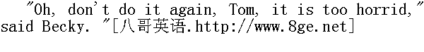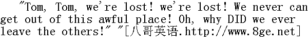 喂,汤姆,别喊了,听起来怪吓人的。"贝基说。 "It is horrid, but I better, Becky; they might hear us, you know," and he shouted again. " 是吓人,但我最好还是喊,贝基,说不准他们能听见我们。"说完他又大喊起来。 The "might" was even a chillier horror than the ghostly laughter, it so confessed a perishing hope. The children stood still and listened; but there was no result. Tom turned upon the back track at once, and hurried his steps. It was but a little while before a certain indecision in his manner revealed another fearful fact to Becky -- he could not find his way back!" 说不准"三个字比那阵阵笑声更可怕,它表明希望正在消失,两个孩子静静地站在那里听着,可什么也没听见。汤姆立即按原路返回,步伐很快。可没多久,他表现出举棋不定的样子。贝基感到十分害怕,汤姆居然连往回走的路也找不着了。 "Oh, Tom, you didn't make any marks!" " 喂,汤姆,你怎么什么记号也没做!" "Becky, I was such a fool! Such a fool! I never thought we might want to come back! No -- I can't find the way. It's all mixed up." " 贝基,我真笨!一个大笨蛋!我根本没想到还会顺原路返回!是的,我们现在迷路了。真是糟糕透顶。"