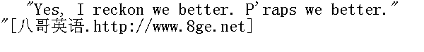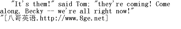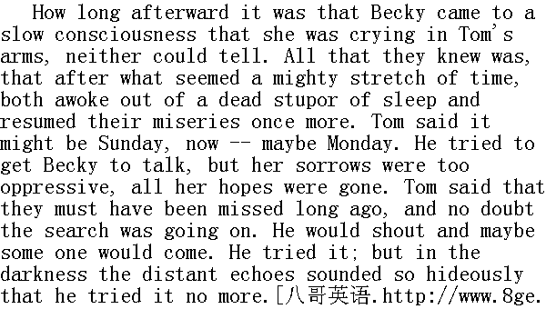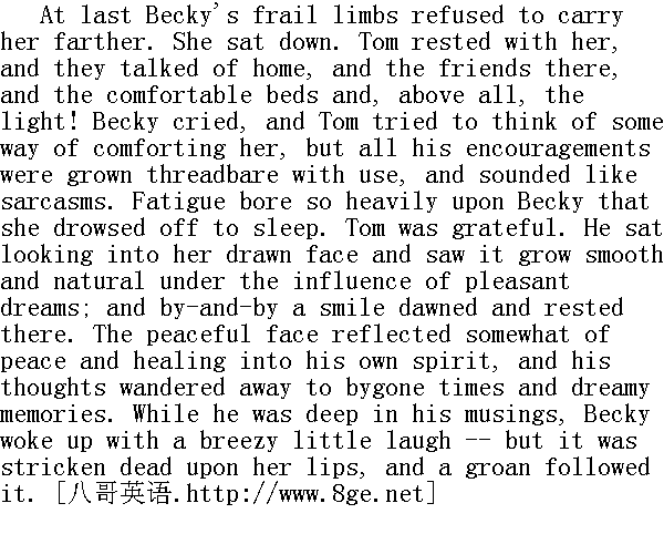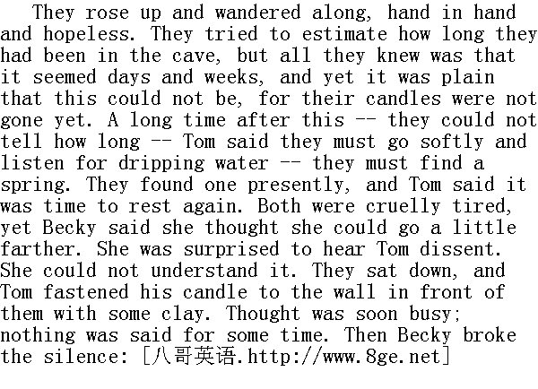 是他们!"汤姆说,"他们来了!快来贝基--我们现在有救了!" The joy of the prisoners was almost overwhelming. Their speed was slow, however, because pitfalls were somewhat common, and had to be guarded against. They shortly came to one and had to stop. It might be three feet deep, it might be a hundred -- there was no passing it at any rate. Tom got down on his breast and reached as far down as he could. No bottom. They must stay there and wait until the searchers came. They listened; evidently the distant shoutings were growing more distant! a moment or two more and they had gone altogether. The heart-sinking misery of it! Tom whooped until he was hoarse, but it was of no use. He talked hopefully to Becky; but an age of anxious waiting passed and no sounds came again.The children groped their way back to the spring. The weary time dragged on; they slept again, and awoke famished and woe-stricken. Tom believed it must be Tuesday by this time. 两个被困在山洞里的"囚犯"高兴得几乎发狂。不过他俩走得很慢,因为脚下不时会碰到坑坑洼洼,必须小心点才行。说着说着,他们就碰到一个坑洼。他俩停下脚步。那坑大约有三英尺深,也许是一百英尺--不管怎么说是跨不过去的。汤姆趴在地上,尽量伸手去摸,可是根本摸不到坑底。他仍必须呆在这里,等待搜寻的人过来。他俩听着,很显然本来就很遥远的喊叫声,现在听起来更远了。一会工夫后,声音一点也听不到了。真是倒霉透顶!汤姆直喊得嗓子都哑了也无济于事。他充满希望地和贝基谈着,可过了一段令人焦虑的时刻后,再也没有听见那远去的喊叫声。孩子们摸索着重新回到泉水旁。时间慢慢地过去了,令人乏味。他们又睡了一觉,等醒来后饥肠辘辘,痛苦不堪,汤姆坚信今天一定是星期二。 Now an idea struck him. There were some side passages near at hand. It would be better to explore some of these than bear the weight of the heavy time in idleness. He took a kite-line from his pocket, tied it to a projection, and he and Becky started, Tom in the lead, unwinding the line as he groped along. At the end of twenty steps the corridor ended in a "jumping-off place." Tom got down on his knees and felt below, and then as far around the corner as he could reach with his hands conveniently; he made an effort to stretch yet a little farther to the right, and at that moment, not twenty yards away, a human hand, holding a candle, appeared from behind a rock! Tom lifted up a glorious shout, and instantly that hand was followed by the body it belonged to -- Injun Joe's! Tom was paralyzed; he could not move. He was vastly gratified the next moment, to see the "Spaniard" take to his heels and get himself out of sight. Tom wondered that Joe had not recognized his voice and come over and killed him for testifying in court. But the echoes must have disguised the voice. Without doubt, that was it, he reasoned. Tom's fright weakened every muscle in his body. He said to himself that if he had strength enough to get back to the spring he would stay there, and nothing should tempt him to run the risk of meeting Injun Joe again. He was careful to keep from Becky what it was he had seen. He told her he had only shouted "for luck." 汤姆突然想出个主意。附近有许多叉路口,与其在这里闲等着急人,不如去闯几条碰碰运气。他从口袋里掏出一根风筝线,把它系在一块突出的石头上,然后和贝基一起上了路。汤姆头里走,边走边放线。大约走出有二十步远,通道往下到了尽头。汤姆跪了下来,往下摸着,顺手摸到拐角处,他又使劲尽量往左边一点摸。这时,不到二十码的地方,有只手,拿着蜡烛,从石头后面出来了。汤姆大喝一声,那只手的主人--印第安·乔的身体立即露了出来。汤姆吓瘫了,他动弹不得。紧接着就见那西班牙人拔腿就跑,转眼就不见了,真是谢天谢地。汤姆在想乔没听出他是谁,否则会过来杀了他,以报他在法庭上作证之仇。山洞里的回音让人无法辨出谁是谁。毫无疑问这就是乔没能认出他的原因,汤姆这样合计着。汤姆被吓得浑身无力。他自言自语道,他要是还有气力回到泉水边,一定呆在那里,无论怎样,都不想再去冒险,碰上印第安·乔就完蛋了。他很谨慎,不想对贝基说出看到了什么。他讲他大喝一声只是为了碰碰运气。 But hunger and wretchedness rise superior to fears in the long run. Another tedious wait at the spring and another long sleep brought changes. The children awoke tortured with a raging hunger. Tom believed that it must be Wednesday or Thursday or even Friday or Saturday, now, and that the search had been given over. He proposed to explore another passage. He felt willing to risk Injun Joe and all other terrors. But Becky was very weak. She had sunk into a dreary apathy and would not be roused. She said she would wait, now, where she was, and die -- it would not be long. She told Tom to go with the kite-line and explore if he chose; but she implored him to come back every little while and speak to her; and she made him promise that when the awful time came, he would stay by her and hold her hand until all was over. 可是从长远的角度来说害怕是次要的,主要的问题是饥饿和疲乏。他俩在泉水旁又度过了一个漫长而又乏味的夜晚,这给他俩带来了转机,孩子们醒来时,饥饿难忍。汤姆坚信日子到了星期三或是星期四,说不定是星期五、星期六都有可能,现在大伙们一定不再寻找他俩了,他提议重找一条出路。他现在觉得就是遇到印第安·乔和什么别的危险也不怕。问题是贝基虚弱得很。她陷入了麻木状态,唤不醒她的精神。她说她就原地呆着等待死亡--这不会太久。她对汤姆说,如果他愿意的话他自己可以顺着风筝线去找出路