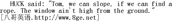 哈克说:"汤姆,要是弄到绳子,我们就可以滑下去,窗户离地面没有多高。" "Shucks! what do you want to slope for?" " 胡说,干吗要溜走呢?" "Well, I ain't used to that kind of a crowd. I can't stand it. I ain't going down there, Tom." " 是这样的,跟一大群人在一起怪不习惯的,受不了。汤姆,反正我不下去。" "Oh, bother! It ain't anything. I don't mind it a bit. I'll take care of you." " 真是的,讨厌!其实下去没什么大不了的事,我根本不在乎,我会照应你的。" Sid appeared. 希德来了。