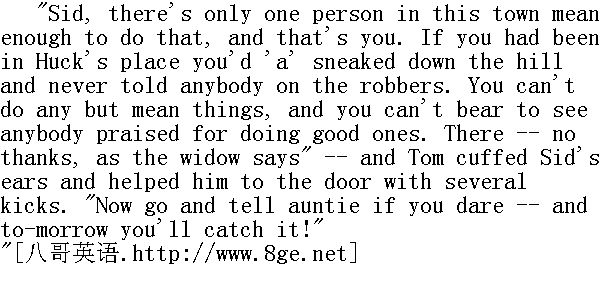 希德,是哪方面的秘密?" "About Huck tracking the robbers to the widow's. I reckon Mr. Jones was going to make a grand time over his surprise, but I bet you it will drop pretty flat." " 就是哈克跟踪强盗到寡妇家的那件事情。我想琼斯想利用此事来个一鸣惊人的举动,不过我敢打赌,他不会成功。" Sid chuckled in a very contented and satisfied way. 希德笑了,心满意足地笑了。 "Sid, was it you that told?" " 希德,是你把秘密泄露出去的吧!" "Oh, never mind who it was. Somebody told -- that's enough." " 得了,别管是谁干的,反正有人已说出了那个秘密,这就够了。"