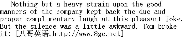 你们看呀!我刚才怎么说的?一半是哈克的,一半是我的!" The spectacle took the general breath away. All gazed, nobody spoke for a moment. Then there was a unanimous call for an explanation. Tom said he could furnish it, and he did. The tale was long, but brimful of interest. There was scarcely an interruption from any one to break the charm of its flow. When he had finished, Mr. Jones said: 这一下使在座的人全都大吃一惊。大家只是瞪眼盯着桌上,一时没有人说话。接着大家一致要求汤姆说出原委。汤姆满口答应,于是就把事情的来龙去脉说了一遍,虽然话很长,但大家却听得津津有味,没有一个人插话打断他的叙述。 汤姆讲完后,琼斯先生说: "I thought I had fixed up a little surprise for this occasion, but it don't amount to anything now. This one makes it sing mighty small, I'm willing to allow." " 我原以为今天我会让大家大吃一惊,可是听了汤姆的叙述,我承认我的根本不算什么了。" The money was counted. The sum amounted to a little over twelve thousand dollars. It was more than any one present had ever seen at one time before, though several persons were there who were worth considerably more than that in property. 钱被过了数,总共有一万二千块美元。尽管在座的人当中,有的家产不止这个数,可是 一次见过这么多钱却还是头一回。 |
