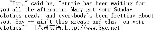 汤姆,"他说,"波莉姨妈一下午都在等你呐。玛丽为你准备好了礼服。大家都为你担心。喂,这不是蜡烛油和粘土吗?在你衣服上。" "Now, Mr. Siddy, you jist 'tend to your own business. What's all this blow-out about, anyway?" " 得了,希德先生,你少管闲事。他们今天为什么在这里大吃大喝呢?" "It's one of the widow's parties that she's always having. This time it's for the Welshman and his sons, on account of that scrape they helped her out of the other night. And say -- I can tell you something, if you want to know." " 这是寡妇家的宴会,她经常请客。这次是为了威尔斯曼和他儿子举行的,感谢他们的救命之恩。喂,还想知道得更多吗?我可以告诉你。" "Well, what?" " 嗯,是什么事?" "Why, old Mr. Jones is going to try to spring something on the people here to-night, but I overheard him tell auntie to-day about it, as a secret, but I reckon it's not much of a secret now. Everybody knows -- the widow, too, for all she tries to let on she don't. Mr. Jones was bound Huck should be here -- couldn't get along with his grand secret without Huck, you know!" " 什么事?老琼斯先生今晚有惊人的消息要告诉这里的人们。他在和姨妈谈这事时,被我听到了这个秘密,不过我想,现在这已算不上什么秘密了,人人都知道,寡妇也知道,但她却尽力掩饰。琼斯先生一定要哈克出席。你瞧,哈克不在场,他怎么能说出那个大秘密呢!"