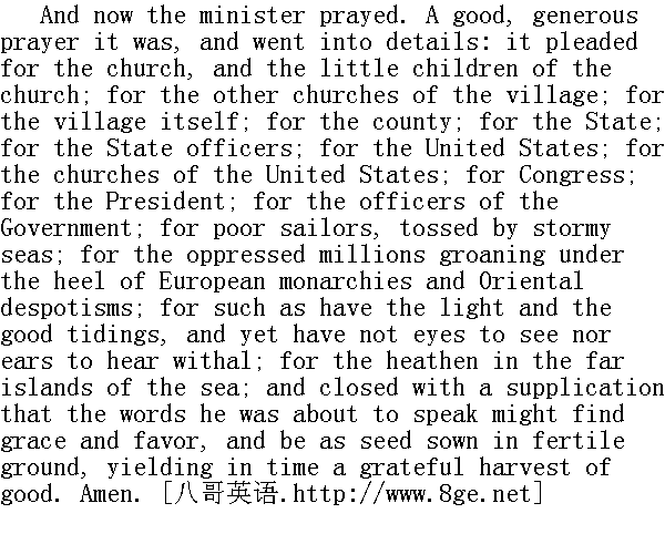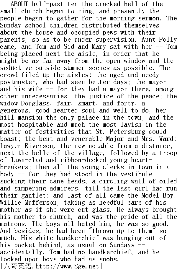 大约10点30分的时候,小教堂的破钟开始响了起来,随即大家便聚集在一起听上午的布道。主日学校的孩子们各随各的父母坐在教堂里,为的是好受他们的监督。波莉姨妈来了,汤姆、希德和玛丽在她旁边坐下来。汤姆被安排在靠近过道的位子上坐着,为的是尽可能和开着的窗户及外面诱人的夏日景物离得远一些。人们簇拥着顺着过道往里走:有上了年纪的贫苦的邮政局局长,他曾经是过过好日子的;有镇长和他的太太--这地方竟然还有个镇长,这和其他许多没有必要的摆设一样;有治安法官;有道格拉斯寡妇,她40来岁,长得小巧而美丽,为人宽厚,慷慨大方而又心地善良,生活还算富裕,她山上的住宅是镇上唯一漂亮讲究的,可算得上殿堂,每逢节庆日,她可是圣彼德堡镇上人们引以为荣的最热情好客、最乐善好施的人;有驼背的、德高望重的华德少校和他的夫人;还有维尔逊律师,一位远道而来的新贵客。再下面就是镇上的大美人,后面跟着一大帮穿细麻布衣服、扎着缎带的、让人害单相思病的年轻姑娘。跟在她们后里的是镇上所有年轻的店员和职员,他们一涌而进--原来他们是一群如痴如醉的爱慕者,开始都站在门廊里,嘬着自己的手指头,围在那儿站成一道墙似的,一直到最后一个姑娘走出他们的包围圈为止。最后进来的一位是村里的模范儿童威利·莫夫逊,他对他母亲照顾得无微不至,就好像她是件易碎的雕花玻璃品似的。他总是领着他妈妈到教堂来,其他的妈妈都引以为豪。而男孩子们都恨他,因为他太乘巧,太听话。况且他常被人夸奖,让他们觉得难堪。他白色的手绢搭拉在屁股口袋的外面,星期天也不例外--偶而有次把除外。汤姆没有手绢,他鄙视那些有手绢的孩子们,把他们看作是故作姿态的势利小人。 The congregation being fully assembled, now, the bell rang once more, to warn laggards and stragglers, and then a solemn hush fell upon the church which was only broken by the tittering and whispering of the choir in the gallery. The choir always tittered and whispered all through service. There was once a church choir that was not ill-bred, but I have forgotten where it was, now. It was a great many years ago, and I can scarcely remember anything about it, but I think it was in some foreign country. The minister gave out the hymn, and read it through with a relish, in a peculiar style which was much admired in that part of the country. His voice began on a medium key and climbed steadily up till it reached a certain point, where it bore with strong emphasis upon the topmost word and then plunged down as if from a spring-board: 听布道的人到齐后,大钟又响了一遍,为的是提醒那些迟到的和在外面乱跑的人。教堂里一片寂静,显得十分庄严,只有边座席上唱诗班里有些低声嘻笑和说话的声音,打破了这种寂静,而且自始至终整个布道过程,唱诗班里一直有人在窃窃私语,低声说笑。曾有过一个唱诗班不像这样没教养,可是我忘记那是在什么地方了。这是许多年以前的事了,我几乎对那些事没有印象了,不过,我想大概是在外国吧。 牧师把大家要唱的歌颂主的歌词拿了出来,津津有味地念了一遍,他那特别的腔调在那地区是受人欢迎的。他的音量先由中音部开始,逐渐升高,一直升到最高音的一个字,强调了一下,然后就像从跳板上跳下来一样,突然降低: Shall I be car-ri-ed toe the skies, on flow'ry beds of ease,Whilst others fight to win the prize, and sail thro' blood-y seas? 为获功勋别人正浴血奋战在沙场我岂能安睡花床梦想 进天堂 He was regarded as a wonderful reader. At church "sociables" he was always called upon to read poetry; and when he was through, the ladies would lift up their hands and let them fall helplessly in their laps, and "wall" their eyes, and shake their heads, as much as to say, "Words cannot express it; it is too beautiful, too beautiful for this mortal earth." 大家一致认为他的朗诵很精彩,很美妙。在教堂的"联欢会"上,他经常被请来给大家朗诵诗文,每当他念完之后,妇女们都要举起双手,然后软绵绵地把手落下来,放在膝上,一面"转溜"着眼睛,一面摇头,好像在说:"这简直是语言无法形容的,太美了,这样动听的声音在这凡俗的人世间实在是太难得了。" After the hymn had been sung, the Rev. Mr. Sprague turned himself into a bulletin-board, and read off "notices" of meetings and societies and things till it seemed that the list would stretch out to the crack of doom -- a queer custom which is still kept up in America, even in cities, away here in this age of abundant newspapers. Often, the less there is to justify a traditional custom, the harder it is to get rid of it. 唱完颂主歌之后,牧师斯普拉格先生就把自己变成了一块布告牌,开始宣布一些集会和团体的通知之类的事情,他一直说个没完,似乎他要宣布事情就得讲个不停直到世界末日霹雳声响时才停止--这是一种很奇怪的习惯,至今在美国还保留着,甚至在当今新闻报纸很多的城市里还没有改变这种习惯。通常传统习俗越是没有多少理由存在,越很难消除它。
