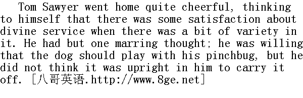 再后来牧师就做祷告了。这是一篇很好的、内容丰富的祷告词,面面俱到:它为教堂和里面的孩子们祈祷;为全县向主求福;为漂泊在狂风暴雨的海洋上可怜的水手们求福;为被迫在欧洲君主制度和东方专制制度铁蹄下呻吟着的数万劳苦大众求福;为那些有了教主的光和福音而熟视无睹、充耳不闻的人求福;为远处海岛上的那些异帮教徒求福;最后牧师祈求天主恩准他所说的话,希望他的话像播种在肥沃土地里的种子一样,将会开花结果,造福无穷。阿门。 There was a rustling of dresses, and the standing congregation sat down. The boy whose history this book relates did not enjoy the prayer, he only endured it -- if he even did that much. He was restive all through it; he kept tally of the details of the prayer, unconsciously -- for he was not listening, but he knew the ground of old, and the clergyman's regular route over it -- and when a little trifle of new matter was interlarded, his ear detected it and his whole nature resented it; he considered additions unfair, and scoundrelly. In the midst of the prayer a fly had lit on the back of the pew in front of him and tortured his spirit by calmly rubbing its hands together, embracing its head with its arms, and polishing it so vigorously that it seemed to almost part company with the body, and the slender thread of a neck was exposed to view; scraping its wings with its hind legs and smoothing them to its body as if they had been coat-tails; going through its whole toilet as tranquilly as if it knew it was perfectly safe. As indeed it was; for as sorely as Tom's hands itched to grab for it they did not dare -- he believed his soul would be instantly destroyed if he did such a thing while the prayer was going on. But with the closing sentence his hand began to curve and steal forward; and the instant the "Amen" was out the fly was a prisoner of war. His aunt detected the act and made him let it go. 站着的人们在一片衣服的沙沙声中都坐了下来。这本书里讲述的主人公并不欣赏这篇祷告词,他只是忍受着罢了,能忍受就算不错了。他在祈祷过程中,一直不安分。他记录下祷告词的详细内容,不过是无意识地这么做--因为他没有听,但是他熟悉牧师先生惯弹的老调,惯用的陈词罢了--每当祷告词里加进一点新内容时,他的耳朵立刻就能辨别出来,而且浑身上下都不舒服。他认为加进去的太不合适,也不光明正大,简直是在耍无赖。在祈祷做到半中间的时候,有一只苍蝇落在他前面的座椅靠背上,它不慌不忙地搓着腿,伸出胳膊抱住头,用劲地擦着脑袋,它的头几乎好像要和身子分家似的,脖子细的像根线,露出来看得清清楚楚。它又用后腿拨弄翅膀,把翅膀向身上拉平,好像翅膀是它礼服的后摆;它不紧不慢,自在逍遥地老在那儿做着一全套梳妆打扮的动作,似乎很清楚自己是绝对安全的。这只苍蝇的逍遥劲让汤姆心里难受极了。那小东西的确很安全,因为当汤姆两手发痒,慢慢地移过去想抓它时,又停住了,他不敢--他相信在做祷告时干这种事情,他的灵魂立刻就会遭到毁灭的。可是,当祷告讲到最后一句时,他弓着手背悄悄地向苍蝇靠过去,"阿门"刚一说出口,苍蝇就做了阶下囚。他姨妈发现后让他把苍蝇放掉了。 The minister gave out his text and droned along monotonously through an argument that was so prosy that many a head by and by began to nod -- and yet it was an argument that dealt in limitless fire and brimstone and thinned the predestined elect down to a company so small as to be hardly worth the saving. Tom counted the pages of the sermon; after church he always knew how many pages there had been, but he seldom knew anything else about the discourse. However, this time he was really interested for a little while. The minister made a grand and moving picture of the assembling together of the world's hosts at the millennium when the lion and the lamb should lie down together and a little child should lead them. But the pathos, the lesson, the moral of the great spectacle were lost upon the boy; he only thought of the conspicuousness of the principal character before the on-looking nations; his face lit with the thought, and he said to himself that he wished he could be that child, if it was a tame lion. 牧师宣布了布道词引用的《圣经》章节,接着就单调乏味地进行施道,如此平淡啰嗦以致于有许多人渐渐地低下头打瞌睡--他的布道词里讲了数不清的各种各样的地狱里的刑罚,让人有种感觉,能够有资格让上帝选入天堂的真是为数极少,几乎不值得拯救了。汤姆计算着祷告词的页数,做完礼拜他总能说出牧师经文的页数,至于内容他是很少知道。然而这一回却不同:他对内容真有点感兴趣了。牧师描绘了幅辉煌而动人的画面:千年至福时期全世界各族人民团聚在一起,狮子和羊羔躺在一起,由一个孩子领着它们。可是这伟大的场面没有一点感动汤姆,他关注的是那里面的人物在成千上万的人们面前所显出的惹人注目的神气。想到这里,他的脸上露出喜色。他暗自想如果那头狮子驯服不吃人的话,他很愿意自己就是那孩子。 Now he lapsed into suffering again, as the dry argument was resumed. Presently he bethought him of a treasure he had and got it out. It was a large black beetle with formidable jaws -- a "pinchbug," he called it. It was in a percussion-cap box. The first thing the beetle did was to take him by the finger. A natural fillip followed, the beetle went floundering into the aisle and lit on its back, and the hurt finger went into the boy's mouth. The beetle lay there working its helpless legs, unable to turn over. Tom eyed it, and longed for it; but it was safe out of his reach. Other pe