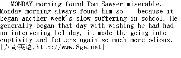 星期一早晨,汤姆·索亚很难受。这个时候汤姆向来是很难受的--因为又一个漫长而难熬的星期开始了。他在这一天总是想要是没有这个休息日夹在中间倒也好些,有了那一天,他感到再到学校里去犹如去坐牢、去受罪,这使他觉得十分厌恶。 Tom lay thinking. Presently it occurred to him that he wished he was sick; then he could stay home from school. Here was a vague possibility. He canvassed his system. No ailment was found, and he investigated again. This time he thought he could detect colicky symptoms, and he began to encourage them with considerable hope. But they soon grew feeble, and presently died wholly away. He reflected further. Suddenly he discovered something. One of his upper front teeth was loose. This was lucky; he was about to begin to groan, as a "starter," as he called it, when it occurred to him that if he came into court with that argument, his aunt would pull it out, and that would hurt. So he thought he would hold the tooth in reserve for the present, and seek further. Nothing offered for some little time, and then he remembered hearing the doctor tell about a certain thing that laid up a patient for two or three weeks and threatened to make him lose a finger. So the boy eagerly drew his sore toe from under the sheet and held it up for inspection. But now he did not know the necessary symptoms. However, it seemed well worth while to chance it, so he fell to groaning with considerable spirit. 汤姆躺在那想着。突然一个念头在脑子里一闪,他希望他生病;这样,他就能待在家里不去上学了。这倒是有可能。他把自己浑身上下仔细地检查了一下,没有发现什么毛病。他又查找了一番,这次他以为可以找出肚子疼的理由,并且满心希望地让疼痛发作。可是不久他就泄了气,根本没有一点疼痛的迹象。于是他又动起脑筋来,突然,他发现目标了。他的上排门牙有一颗松了劲。他真是太运气了;他正打算开始呻吟,用他的话说这叫"开场白",这时他猛然想起如果他提出这个理由来应付的话,他姨妈就会当真把这颗牙拔出来,那将偷鸡不成反蚀一把米。所以他想暂时先留着这颗牙,再另找毛病。找了一段时间,他没找到什么毛病,后来他想起曾听医生说过有一种病能让病人躺两三个星期,而且弄不好会烂掉一只手指头。于是这孩子急忙把他那只肿痛的脚趾头从被子里搬出来,举起来仔细察看。可是,他又不清楚那种病有些什么病症。不管怎么说,试还是值得一试的,于是他煞有介事地开始呻吟起来。 But Sid slept on unconscious.Tom groaned louder, and fancied that he began to feel pain in the toe. 可是希德仍然睡着,一点反应都没有。汤姆呻吟得更响了,而且感到他的脚真地痛起来。 No result from Sid. 希德还是一动不动。 Tom was panting with his exertions by this time. He took a rest and then swelled himself up and fetched a succession of admirable groans. 汤姆因为呻吟得太吃力,累得喘着粗气。他停了一会,重新鼓起劲头,发出一连串绝妙的呻吟声。