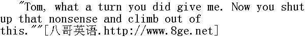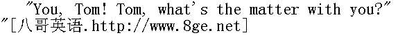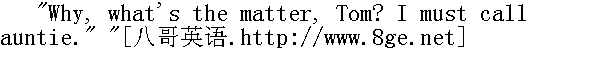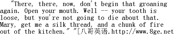 汤姆,你真地把我吓坏了。好了,闭上嘴巴,别再胡扯八道了,快起床吧。" The groans ceased and the pain vanished from the toe. The boy felt a little foolish, and he said: 呻吟声停了,脚趾的疼痛也立刻消失了。这孩子觉得有点不好意思,于是他说: "Aunt Polly, it seemed mortified, and it hurt so I never minded my tooth at all." " 波莉姨妈,脚趾头看着真像是发炎了,痛得我把牙齿的事忘得一干二净。" "Your tooth, indeed! What's the matter with your tooth?" " 有一颗牙松动了,而且的确痛得难受。" "One of them's loose, and it aches perfectly awful." " 你的牙齿,真是怪事!牙齿又怎么啦?"