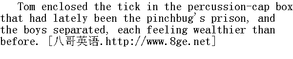 是的,我不会告诉任何人,现在让我看吧。" "Oh, you don't want to see!" " 啊,你真想看吗!" "Now that you treat me so, I will see." And she put her small hand upon his and a little scuffle ensued, Tom pretending to resist in earnest but letting his hand slip by degrees till these words were revealed: "I love you." " 既然你这样待我,我就一定要看!"于是她把小手儿按在他手上,两个人争了一会儿,汤姆假装拼命捂着不让她看的样子,可是手渐渐移开,露出了三个字:"我爱你。" "Oh, you bad thing!" And she hit his hand a smart rap, but reddened and looked pleased, nevertheless. " 啊,你坏蛋!"她用力打了他的手,脸虽然红了,但心里却乐滋滋的。 Just at this juncture the boy felt a slow, fateful grip closing on his ear, and a steady lifting impulse. In that vise he was borne across the house and deposited in his own seat, under a peppering fire of giggles from the whole school. Then the master stood over him during a few awful moments, and finally moved away to his throne without saying a word. But although Tom's ear tingled, his heart was jubilant. 就在这时,汤姆觉得有人慢慢地抓住他的耳杂,渐渐往上提起。这一抓非同小同,让汤姆挣脱不掉。就这样,在一片尖刻的咯咯笑声中他被钳着耳杂,从教室这边拉到那边自己的座位上。接着老师在他身旁站了一会,教室里肃然起敬,然后他则一言不发,回到了自己的宝座上。汤姆虽然感到耳朵很疼,但心里却是甜蜜蜜的。