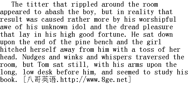 教室里到处都是窃窃私语声,似乎是这让汤姆脸红。但实际上,他脸红是因为崇拜那位素不相识的女孩,还有幸能和她同桌。他在松木板凳的一头坐下来,那女孩子一仰头,身子往另一头移了移。大家相互推推胳膊,眨眨眼睛,低声耳语。但是汤姆却正襟危坐,两只胳膊放在既长又矮的书桌上,好像在看书学习。 By and by attention ceased from him, and the accustomed school murmur rose upon the dull air once more. Presently the boy began to steal furtive glances at the girl. She observed it, "made a mouth" at him and gave him the back of her head for the space of a minute. When she cautiously faced around again, a peach lay before her. She thrust it away. Tom gently put it back. She thrust it away again, but with less animosity. Tom patiently returned it to its place. Then she let it remain. Tom scrawled on his slate, "Please take it -- I got more." The girl glanced at the words, but made no sign. Now the boy began to draw something on the slate, hiding his work with his left hand. For a time the girl refused to notice; but her human curiosity presently began to manifest itself by hardly perceptible signs. The boy worked on, apparently unconscious. The girl made a sort of non-committal attempt to see, but the boy did not betray that he was aware of it. At last she gave in and hesitatingly whispered: 渐渐地,大家的注意力不再集中在汤姆身上,学校里惯有的低沉的读书声重新在那沉闷的空气中响起。这时汤姆偷偷地瞥了那女孩几次。她注意到了,"朝他做了鬼脸"之后有一分钟光景,她都用后脑勺冲着他。等她慢慢地转过脸来时,有一个桃子摆在了她的面前。她把桃子推开,汤姆又轻轻地把它放回去。她又把桃子推开,不过这次态度缓和了些。汤姆耐心地把它又放回原处。这一回她没有再拒绝了。汤姆在他的写字板上写了几个字:"请你收下吧,我多得是哩。"那女孩瞥了瞥这些字,仍是一动也不动。于是汤姆就用左手挡住写字板,开始在上面画着图画。有好一阵子,那女孩坚决不去看他作画,可是在好奇心的驱使下,她开始动摇了。汤姆继续画着,好像不知道那回事。那女孩想看,但态度不明朗,可是这男孩还是不动声色,装作没看见。最后她让了步,犹犹豫豫小声说道: "Let me see it." " 让我看看吧。" Tom partly uncovered a dismal caricature of a house with two gable ends to it and a corkscrew of smoke issuing from the chimney. Then the girl's interest began to fasten itself upon the work and she forgot everything else. When it was finished, she gazed a moment, then whispered: 汤姆略微挪开左手,石板上画的是座房子,画得既不好又模模糊糊,两个山墙头,还有一缕炊烟从烟囱里袅袅升起。可是姑娘的兴趣被吸引住了,于是,她把一切都抛到了九霄云外。画画好的时候,她盯着看了一会,然后低声说: "It's nice -- make a man." " 画得真好--再画一个人上去。"