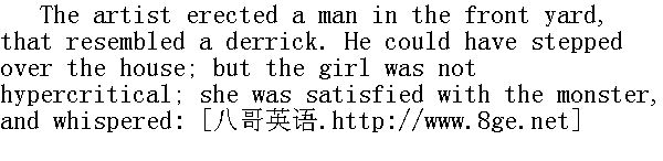 于是,这位"画家"就在前院里画了一个人,他拔地而起,那形状有点像一架人字起重机,他一大步就可以跨过房子。可是这姑娘并不在乎这一点。她对这个大怪物很满意。她低声说: "It's a beautiful man -- now make me coming along." " 这个人画得真好看,再画就画我,画成正走过来的样子。" Tom drew an hour-glass with a full moon and straw limbs to it and armed the spreading fingers with a portentous fan. The girl said: 汤姆就画了个水漏或沙漏(均可作计时器用),加上一轮满月,四肢像草扎似的,硬梆梆的,张开的手指拿着一把大得可怕的扇子。 姑娘说: "It's ever so nice -- I wish I could draw." " 画得太好了。我要是会画就好了。" "It's easy," whispered Tom, "I'll learn you." " 这容易,"汤姆低声说道,"跟我学。"