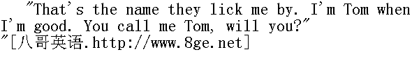 啊,你愿意吗?什么时候教我?" "At noon. Do you go home to dinner?" " 中午。你回家吃午饭吗?" "I'll stay if you will." " 如果你教我,我就留在这里。" "Good -- that's a whack. What's your name?" " 好,那太好不过了。你叫什么名字?" "Becky Thatcher. What's yours? Oh, I know. It's Thomas Sawyer." " 贝基·撒切尔,你叫什么?哦,我知道,你叫托马斯·索亚。"