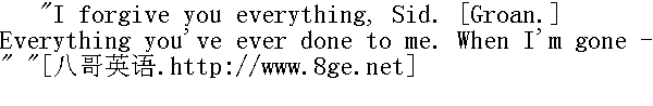 希德,我什么事情都原谅你(呻吟)。你对我所干的一切事情我都不怪罪你。我死了以后……" "Oh, Tom, you ain't dying, are you? Don't, Tom -- oh, don't. Maybe --" " 喔,汤姆,你不会死的,别这样,汤姆--啊,别这样。也许……" "I forgive everybody, Sid. [Groan.] Tell 'em so, Sid. And Sid, you give my window-sash and my cat with one eye to that new girl that's come to town, and tell her --" " 希德,我原谅所有的人(呻吟)。希德,请你转告他们吧。希德,你把我那个窗户框子和那只独眼小猫给那个新搬来的姑娘吧,你对她说……" But Sid had snatched his clothes and gone. Tom was suffering in reality, now, so handsomely was his imagination working, and so his groans had gathered quite a genuine tone. 可是希德早就抓起衣服跑出去了。这时候汤姆真地感到很难受了,没想到想象力竟起了这么大的作用,于是他的呻吟声就装得像真的一样了。 Sid flew down-stairs and said: 希德飞快地跑下楼,边跑边喊道: