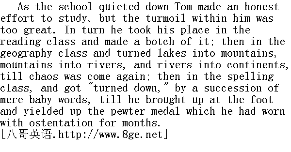 班里静下来时,汤姆动起真格来要好好学习,可是内心却不能平静下来。结果朗读时,他读得别别扭扭;而在地理课上,他把湖泊当成山脉,一切都被他"恢复"到了原始混沌状态;上拼写课时,一连串最简单的字弄得他"翻了船",结果成绩在全班垫了底,他只好把戴在身上、风光了好几个月的那枚奖章退给了老师。 |