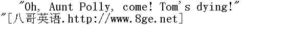 波莉姨妈,快来呀!汤姆要死了!" "Dying!" " 要死了?!" "Yes'm. Don't wait -- come quick!" " 是的,姨妈。来不及了,快上来!" "Rubbage! I don't believe it!" " 瞎讲!我不相信!" But she fled up-stairs, nevertheless, with Sid and Mary at her heels. And her face grew white, too, and her lip trembled. When she reached the bedside she gasped out: 可是她还是赶快地跑上楼去,希德和玛丽紧跟在后面。这时她脸色也白了,嘴唇直颤动。来到床边后,她喘着气问: