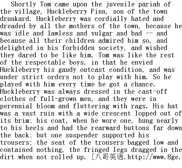 不久汤姆遇到了村子里坏孩子哈克贝利·费恩,他是本镇一个酒鬼的儿子。全镇所有的母亲们对哈克贝利都深恶痛绝而又十分畏惧:他游手好闲、无法无天,而且既下流又没教养--再加上所有的孩子却又都非常羡慕他。虽然大人们都不允许他们和他接触,他们却乐于和他玩耍,还希望自己也敢学他那样。和其他许多体面的孩子们一样,汤姆很羡慕哈克贝利那种逍遥自在的流浪儿生活,可是也被严厉地告知:不许和他玩。所以,他每每一有机会就和他混在一起。哈克贝利经常穿着大人们丢弃不要的旧衣服,总是满身开花,破布乱飘。他的帽子很大很破,边上有一块月牙形的帽边子耷拉着。他要是穿着上装的话,那上装就差不多拖到他的脚后跟,背后的两排并齐的扣子一直扣到屁股;裤子却只有一根吊带;裤子裆部像个空空的口袋似地垂得很低。裤腿没有卷起的时候,毛了边的下半截就在灰土里拖来拖去。 Huckleberry came and went, at his own free will. He slept on doorsteps in fine weather and in empty hogsheads in wet; he did not have to go to school or to church, or call any being master or obey anybody; he could go fishing or swimming when and where he chose, and stay as long as it suited him; nobody forbade him to fight; he could sit up as late as he pleased; he was always the first boy that went barefoot in the spring and the last to resume leather in the fall; he never had to wash, nor put on clean clothes; he could swear wonderfully. In a word, everything that goes to make life precious that boy had. So thought every harassed, hampered, respectable boy in St. Petersburg. 哈克贝利来去很自由,全凭自己高兴。天气晴朗的时候,他就睡在门口台阶上;下雨时,就睡到大空桶里。他不用去上学也不必去做礼拜,不必叫谁老师,也不用服从谁;他可以随时随地去钓鱼,去游泳,而且想呆多长间就呆多长时间;也没有人管住他打架;晚上他高兴熬夜到什么时候就熬到什么时候;春天他总是第一个光着脚,到了秋天却是最后一个穿上鞋;他从来不用洗脸,也不用穿干净衣服;他可以随便骂人,而且特别会骂。总而言之,一切充分享受生活的事情,这孩子都拥有了。圣彼德堡镇的那些受折磨、受拘束的体面孩子们个个都是这么想的。 Tom hailed the romantic outcast: 汤姆向那个浪漫的流浪儿招呼道: "Hello, Huckleberry!" " 你好啊,哈克贝利!" "Hello yourself, and see how you like it." " 你也好啊,喜欢这玩意吧。"