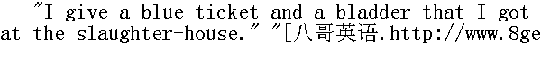 我给他一张蓝色票和一只从屠宰厂那儿弄来的尿泡。" "Where'd you get the blue ticket?" " 你的蓝票是从哪儿弄来的?" "Bought it off'n Ben Rogers two weeks ago for a hoop-stick." " 两星期前用一根推铁环的棍子和贝恩·罗杰换的。" "Say -- what is dead cats good for, Huck?" " 我说--哈克,死猫能有什么用?" "Good for? Cure warts with." " 有什么用?可以治疣子。"