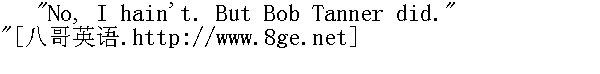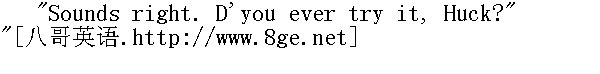 不会吧!你说能治吗?我知道有个更好的药方子。" "I bet you don't. What is it?" " 我敢打赌你不知道。是什么方子?" "Why, spunk-water." " 不就是仙水吗。" "Spunk-water! I wouldn't give a dern for spunk-water." " 仙水!我看仙水一文钱不值?" "You wouldn't, wouldn't you? D'you ever try it?" " 你说一文钱不值,是不是?你试过吗?"