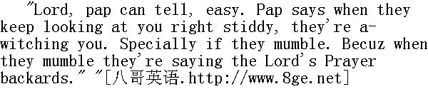 哦,我的老天爷!我爹一眼就看出来了。我爹说她们直勾勾地盯着你时,就是要迷惑你,特别是当嘴里还念着咒时,就更不用说了。这时,她们把圣经的祷文倒过来念。" "Say, Hucky, when you going to try the cat?"" 嘿,我说哈克,你打算什么时候去试着用这猫治疣子?" "To-night. I reckon they'll come after old Hoss Williams to-night." " 今天夜里。我猜他们会去弄霍斯·威廉斯这老家伙。" "But they buried him Saturday. Didn't they get him Saturday night?" " 可是他不是星期六被埋了吗?他们星期六夜里没来把他弄走吗?" "Why, how you talk! How could their charms work till midnight? -- and then it's Sunday. Devils don't slosh around much of a Sunday, I don't reckon." " 嘿,瞧你说的!他们的咒语午夜后怎么能起作用呢?午夜一过那可就是星期天了。我猜想,真是星期天鬼是不怎么四处游荡的。"