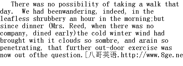 那天,出去散步是不可能了。其实,早上我们还在光秃秃的灌木林中溜达了一个小时,但从午饭时起(无客造访时,里德太太很早就用午饭)便刮起了冬日凛冽的寒风,随后阴云密布,大雨滂沱,室外的活动也就只能作罢了。
