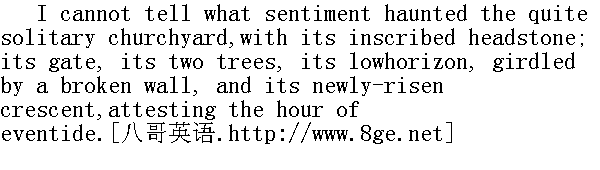 我说不清一种什么样的情调弥漫在孤寂的墓地:刻有铭文的墓碑、一扇大门、两棵树、低低的地平线、破败的围墙。一弯初升的新月,表明时候正是黄昏。
