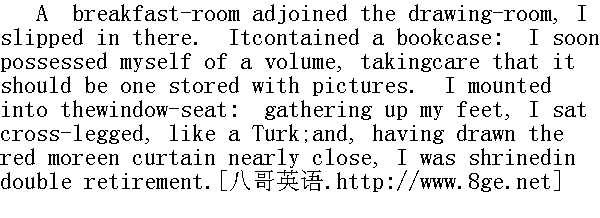 客厅的隔壁是一间小小的餐室,我溜了进去。里面有一个书架。不一会儿,我从上面拿下一本书来,特意挑插图多的,爬上窗台,缩起双脚,像土耳其人那样盘腿坐下,将红色的波纹窗帘几乎完全拉拢,把自己加倍隐蔽了起来。