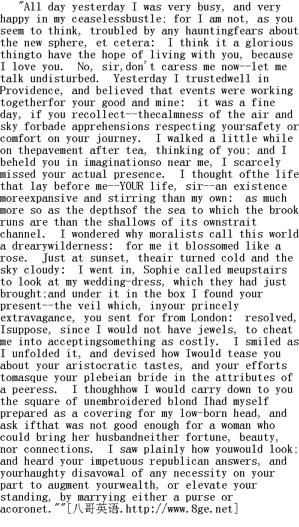 昨天我忙了一整天,在无休止的忙碌中,我非常愉快。因为不像你似乎设想的那样,我并没有为新天地之类的忧虑而烦恼。我认为有希望同你一起生活是令人高兴的,因为我爱你。--不,先生,现在别来抚摸我--不要打扰我,让我说下去。昨天我笃信上苍,相信对你我来说是天助人愿。你总还记得,那是个晴朗的日子,天空那么宁静,让人毋须为你路途的平安和舒适担忧。甩完茶以后,我在石子路上走了一会,思念着你。在想象中,我看见你离我很近,几乎就在我跟前。我思忖着展现在我面前的生活--你的生活,先生--比我的更奢华,更激动人心,就像容纳了江河的大海深处,同海峡的浅滩相比,有天壤之别。我觉得奇怪,为什么道德学家称这个世界为凄凉的荒漠,对我来说,它好像盛开的玫瑰。就在夕阳西下的时候,气温转冷,天空布满阴云,我便走进屋去了。索菲娅叫我上楼去看看刚买的婚礼服,在婚礼服底下的盒子里,我看见了你的礼物--是你以王子般的阔绰,叫人从伦敦送来的面纱,我猜想你是因为我不愿要珠宝,而决计哄我接受某种昂贵的东西。我打开面纱,会心地笑了笑,算计着我怎样来嘲弄你的贵族派头,取笑你费尽心机要给你的平民新娘戴上贵族的假面。我设想自己如何把那块早已准备好遮盖自己出身卑微的脑袋,没有绣花的花边方丝巾拿下来,问问你,对一个既无法给她的丈夫提供财富、美色,也无法给他带来社会关系的女人,是不是够好的了。我清清楚楚地看到了你的表情。听到了你激烈而开明的回答;听到你高傲地否认有必要仰仗同钱袋与桂冠结亲,来增加自己的财富,或者提高自己的地位。" "How well you read me, you witch!" interposed Mr. Rochester: "butwhat did you find in the veil besides its embroidery? Did you findpoison, or a dagger, that you look so mournful now?"" 你把我看得真透,你这女巫!"罗切斯特先生插嘴道,"但除了刺绣之外,你还在面纱里发现了什么,你是见到了毒药,还是匕首,弄得现在这么神色悲哀?" "No, no, sir; besides the delicacy and richness of the fabric, Ifound nothing save Fairfax Rochester's pride; and that did not scareme, because I am used to the sight of the demon. But, sir, as itgrew dark, the wind rose: it blew yesterday evening, not as itblows now--wild and high--but 'with a sullen, moaning sound' farmore eerie. I wished you were at home. I came into this room, andthe sight of the empty chair and fireless hearth chilled me. Forsome time after I went to bed, I could not sleep--a sense of anxiousexcitement distressed me. The gale still rising, seemed to my earto muffle a mournful under-sound; whether in the house or abroad Icould not at first tell, but it recurred, doubtful yet doleful atevery lull; at last I made out it must be some dog howling at adistance. I was glad when it ceased. On sleeping, I continued indreams the idea of a dark and gusty night. I continued also thewish to be with you, and experienced a strange, regretfulconsciousness of some barrier dividing us. During all my firstsleep, I was following the windings of an unknown road; totalobscurity environed me; rain pelted me; I was burdened with thecharge of a little child: a very small creature, too young andfeeble to walk, and which shivered in my cold arms, and wailedpiteously in my ear. I thought, sir, that you were on the road along way before me; and I strained every nerve to overtake you, andmade effort on effort to utter your name and entreat you to stop--but my movements were fettered, and my voice still died awayinarticulate; while you, I felt, withdrew farther and farther everymoment."" 没有,没有,先生。除了织品的精致和华丽,以及费尔法克斯.罗切斯特的傲慢,我什么也没有看到。他的傲慢可吓不倒我,因为我己见惯了魔鬼。可是,先生,天越来越黑,风也越来越大了。昨天的风不像现在的这样刮得强劲肆虐,而是响着"沉闷的低吟声,,显得分外古怪。我真希望你还在家里。我走进这个房间,一见到空空荡荡的椅子和没有生火的炉子,心便凉了半截。上床以后,我因为激动不安、忧心忡忡而久久不能入睡。风势仍在增强,在我听来,它似乎裹夹着一阵低声的哀鸣。这声音来自屋内还是户外,起初我无法辨认,但后来重又响了起来,每次间歇听上去模糊而悲哀。最后我终于弄清楚那一定是远处的狗叫声。后来叫声停了,我非常高兴。但一睡着,又继续梦见月黑风高的夜晚,继续盼着同你在一起,并且奇怪而遗憾地意识到,某种障碍把我们隔开了。刚睡着的时候,我沿着一条弯弯曲曲的陌生的路走着,四周一片模糊,雨点打在我身上,我抱着一个孩子,不堪重负。一个小不点儿,年纪太小身体又弱,不能走路,在我冰冷的怀抱里颤抖,在我耳旁哀哀地哭泣。我想,先生,你远远地走在我前面,我使出浑身劲儿要赶上你,一次次奋力叫着你的名字,央求你停下来一-但我的行动被束缚着,我的嗓音渐渐地沉下去,变得模糊不清,而你,我觉得分分秒秒离我越来越远了。" "And these dreams weigh on your spirits now, Jane, when I am closeto you? Little nervous subject! Forget visionary woe, and thinkonly of real happiness! You say you love me, Janet: yes--I willnot forget that; and you cannot deny it. THOSE words did not dieinarticulate on your lips. I heard them clear and soft: a thoughttoo solemn perhaps, but sweet as music--'I think it is a gloriousthing to have the hope of living with you, Edward, because I loveyou.' Do you love me, Jane?--repeat it."" 难道现在我在你跟前了,简,这些梦还使你心情沉重吗?神经质的小东西!忘掉梦幻中的灾祸,单想现实中的幸福吧!你说你爱我,珍妮特,不错--那我不会忘记,你