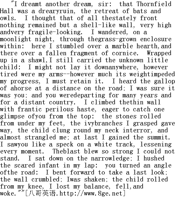 我还做了另外一个梦,先生。梦见桑菲尔德府已是一处凄凉的废墟,成了蝙蝠和猫头鹰出没的地方。我想,那气派非凡的正壁已荡然无存,只剩下了一道贝壳般的墙,看上去很高也很单簿。在一个月光如水的夜晚,我漫步穿过里面杂草丛生的围场。一会儿这里绊着了大理石火炉,一会儿那里碰到了倒地的断梁。我披着头巾,仍然抱着那个不知名的孩子。尽管我的胳膊很吃力,我却不能把它随便放下-一尽管孩子拖累着我,但我必须带着它。我听见了远处路上一匹马的奔驰声。可以肯定那是你,而你离开已经多年,去了一个遥远的国家。我疯也似地不顾危险匆匆爬上那道薄薄的墙,急于从顶上看你一眼,石头从我的脚下滚落,我抓住的枝藤松开了,那孩子恐惧地紧抱住我的脖子,几乎使我窒息。最后我爬到了墙顶。我看见你在白色的路上象一个小点点,越来越小,越来越小。风刮得那么猛,我简直站都站不住。我坐在狭窄的壁架上,使膝头这个神圣婴儿安静下来。你在路上拐了一个弯,我俯下身子去看最后一眼。墙倒塌了,我抖动了一下,孩子从我膝头滚下,我失去了平衡,跌了下来,醒过来了。" "Now, Jane, that is all."" 现在,简,讲完了吧。" "All the preface, sir; the tale is yet to come. On waking, a gleamdazzled my eyes; I thought--Oh, it is daylight! But I was mistaken;it was only candlelight. Sophie, I supposed, had come in. Therewas a light in the dressing-table, and the door of the closet,where, before going to bed, I had hung my wedding-dress and veil,stood open; I heard a rustling there. I asked, 'Sophie, what areyou doing?' No one answered; but a form emerged from the closet; ittook the light, held it aloft, and surveyed the garments pendentfrom the portmanteau. 'Sophie! Sophie!' I again cried: and stillit was silent. I had risen up in bed, I bent forward: firstsurprise, then bewilderment, came over me; and then my blood creptcold through my veins. Mr. Rochester, this was not Sophie, it wasnot Leah, it was not Mrs. Fairfax: it was not--no, I was sure ofit, and am still--it was not even that strange woman, Grace Poole."" 序幕完了,先生,故事还没有开场呢。醒来时一道强光弄得我眼睛发花。我想--呵,那是日光!可是我搞错了,那不过是烛光。我猜想索菲娅已经进屋了。梳妆台上有一盏灯,而衣橱门大开着,睡觉前我曾把我的婚礼服和面纱放进橱里。我听见了一阵悉悉粹粹的声音。我问,'索菲娅,你在干嘛?'没有人回答。但是一个人影从橱里出来。它端着蜡烛,举得高高的,并且仔细端详着从架子上垂下来的衣服,'索菲娅!索菲娅!'我又叫了起来,但它依然默不作声。我已在床上坐了起来,俯身向前。我先是感到吃惊,继而迷惑不解。我血管里的血也冷了。罗切斯特先生,这不是索菲娅,不是莉娅,也不是费尔法克斯太太。它不是一-不,我当时很肯定,现在也很肯定--甚至也不是那个奇怪的女人格雷斯.普尔。"