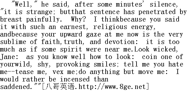 行啦,"他沉默片刻后说,"真奇怪,那句话刺痛了我的胸膛。为什么呢?我想是因为你说得那么虔敬,那么富有力量,因为你抬眼看我时,目光里透出了极度的信赖、真诚和忠心。那太难受了,仿佛在我身边的是某个精灵。摆出凶相来吧,简,你很明白该怎么摆。装出任性、腼腆、挑衅的笑容来,告诉我你恨我--戏弄我,惹怒我吧,什么都行,就是别打动我。我宁愿发疯而不愿哀伤。" "I will tease you and vex you to your heart's content, when I havefinished my tale: but hear me to the end."" 等我把故事讲完,我会让你心满意足地戏弄你,惹怒你,听我讲完吧。" "I thought, Jane, you had told me all. I thought I had found thesource of your melancholy in a dream."" 我想,简,你已经全都告诉我啦,我认为我已经发现你的忧郁全因为一个梦!" I shook my head. "What! is there more? But I will not believe itto be anything important. I warn you of incredulity beforehand. Goon." 我摇了摇头。"什么!还有别的!但我不相信是什么了不起的事情。有话在先,我表示怀疑,讲下去吧。" The disquietude of his air, the somewhat apprehensive impatience ofhis manner, surprised me: but I proceeded. 他神态不安,举止有些忧虑焦躁,我感到很惊奇,但我继续说下去了。
