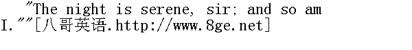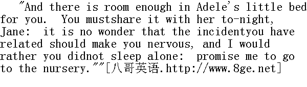 阿黛勒的小床还能睡得下你的,今晚得跟她一起睡,简。你说的事情会使你神经紧张,那也毫不奇怪。我倒情愿你不要单独睡,答应我到育儿室去。" "I shall be very glad to do so, sir."" 我很乐意这样做,先生。" "And fasten the door securely on the inside. Wake Sophie when yougo upstairs, under pretence of requesting her to rouse you in goodtime to-morrow; for you must be dressed and have finished breakfastbefore eight. And now, no more sombre thoughts: chase dull careaway, Janet. Don't you hear to what soft whispers the wind hasfallen? and there is no more beating of rain against the window-panes: look here" (he lifted up the curtain)--"it is a lovelynight!"" 从里面把门拴牢。上楼的时候把索菲娅叫醒,就说请她明天及时把你叫醒,因为你得在八点前穿好衣服,吃好早饭。现在别再那么忧心忡忡了,抛开沉重的烦恼,珍妮特。你难道没有听见轻风的细语?雨点不再敲打窗户,瞧这儿--(他撩起窗帘)多么可爱的夜晚!" It was. Half heaven was pure and stainless: the clouds, nowtrooping before the wind, which had shifted to the west, were filingoff eastward in long, silvered columns. The moon shone peacefully. 确实如此。半个天空都明净如水。此刻,风已改由西面吹来,轻云在风前疾驰,朝东排列成长长的银色园柱,月亮洒下了宁静的光辉。 "Well," said Mr. Rochester, gazing inquiringly into my eyes, "how ismy Janet now?"" 好吧,"罗切斯特先生说,一边带着探询的目光窥视我。"这会儿我的珍妮特怎么样了?"