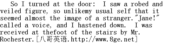 于是我在门边转过身来,看到了一个穿了袍子,戴了面纱的人,一点都不像我往常的样子,就仿佛是一位陌生人的影像。"简!"一个声音嚷道,我赶紧走下楼去。罗切斯特先生在楼梯脚下迎着我。 "Lingerer!" he said, "my brain is on fire with impatience, and youtarry so long!"" 磨磨蹭蹭的家伙,"他说,"我的脑袋急得直冒火星、你太拖拉了!" He took me into the dining-room, surveyed me keenly all over,pronounced me "fair as a lily, and not only the pride of his life,but the desire of his eyes," and then telling me he would give mebut ten minutes to eat some breakfast, he rang the bell. One of hislately hired servants, a footman, answered it. 他带我进了餐室,急切地把我从头到脚打量了一遍,声称我"像百合花那么美丽,不仅是他生活中的骄傲,而且也让他大饱眼福。"随后他告诉我只给我十分钟吃早饭,并按了按铃。他新近雇用的一个仆人,一位管家应召而来。 "Is John getting the carriage ready?"" 约翰把马车准备好了吗?" "Yes, sir."" 好了,先生。"