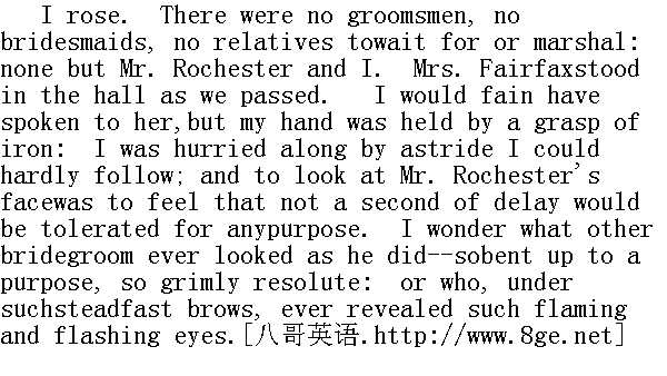 我站了起来,没有男傧相和女傧相,也没有亲戚等候或引领。除了罗切斯特先生和我,没有别人。我们经过大厅时,费尔法克斯太太站在那里。我本想同她说话,但我的手被铁钳似地捏住了,让我几乎跟不住的脚步把我匆匆推向前去。一看罗切斯特先生的脸我就觉得,不管什么原因,再拖一秒钟他都不能忍耐了。我不知道其他新郎看上去是不是像他这付样子--那么专注于一个目的,那么毅然决然;或者有谁在那对稳重的眉毛下,露出过那么火辣辣,光闪闪的眼睛。 I know not whether the day was fair or foul; in descending thedrive, I gazed neither on sky nor earth: my heart was with my eyes;and both seemed migrated into Mr. Rochester's frame. I wanted tosee the invisible thing on which, as we went along, he appeared tofasten a glance fierce and fell. I wanted to feel the thoughtswhose force he seemed breasting and resisting. 我不知道那天天气是好还是不好,走下车道时,我既没观天也没看地,我的心灵与眼目都集中在罗切斯特先生身上。我边走边要看看他好像恶狠狠盯着的无形东西,要感受那些他似乎在对抗和抵御的念头。 At the churchyard wicket he stopped: he discovered I was quite outof breath. "Am I cruel in my love?" he said. "Delay an instant:lean on me, Jane." 我们在教堂院子边门停了下来,他发现我喘不过气来了。"我爱得有点残酷吗?"他问。"歇一会儿,靠着我,简。" And now I can recall the picture of the grey old house of God risingcalm before me, of a rook wheeling round the steeple, of a ruddymorning sky beyond. I remember something, too, of the green grave-mounds; and I have not forgotten, either, two figures of strangersstraying amongst the low hillocks and reading the mementoes gravenon the few mossy head-stones. I noticed them, because, as they sawus, they passed round to the back of the church; and I doubted notthey were going to enter by the side-aisle door and witness theceremony. By Mr. Rochester they were not observed; he was earnestlylooking at my face from which the blood had, I daresay, momentarilyfled: for I felt my forehead dewy, and my cheeks and lips cold.When I rallied, which I soon did, he walked gently with me up thepath to the porch. 如今,我能回忆起当时的情景:灰色的老教堂宁静地耸立在我面前;一只白嘴鸦在教堂尖顶盘旋;远处的晨空通红通红。我还隐约记得绿色的坟墩;也并没有忘记两个陌生的人影,在低矮的小丘之间徘徊,-边读着刻在几块长满青苔的墓石上的铭文。这两个人引起了我的注意,因为一见到我们,他们便转到教堂背后去了。我相信他们要从侧廊的门进去,观看婚礼仪式。罗切斯特先生并没有注意到这两个人,他热切地瞧着我的脸,我想我的脸一时毫无血色,因为我觉得我额头汗涔涔,两颊和嘴唇冰凉。但我不久便定下神来,同他沿着小径,缓步走向门廊。