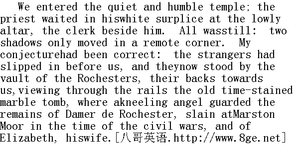我们进了幽静而朴实的教堂,牧师身穿白色的法衣,在低矮的圣坛等候,旁边站着执事。一切都十分平静,那两个影子在远远的角落里走动。我的猜测没有错,这两个陌生人在我们之前溜了进来,此刻背朝着我们,站立在罗切斯特家族的墓穴旁边,透过栅栏,瞧着带有时间印迹的古老大理石坟墓,这里一位下跪的天使守卫着内战中死于马斯顿荒原的戴默尔.德.罗切斯特的遗骸和他的妻子伊丽莎白。
